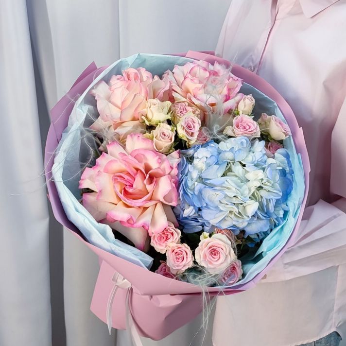 Букет с розовыми розами и голубой гортензией - сочетание нежное и невероятно популярное)