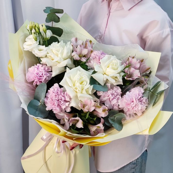 В составе этого нежного букета воздушные белые розы, кружевные диантусы, белая эустома и неверояные стойкие альстромерии. Веточки эвкалипта придают букету раскидистую форму, а нежная упаковка гармонично дополняет тего.