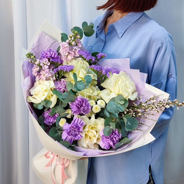 Нежный букет в розово- сиреневых тонах. В составе букета  - ароматная матиола 2 шт, диантус 1 шт, альстромерия 3 шт, кустовая роза 2 шт, пышная розовая французская роза 3 шт, упаковка матовая 1 шт, лента 1 шт.