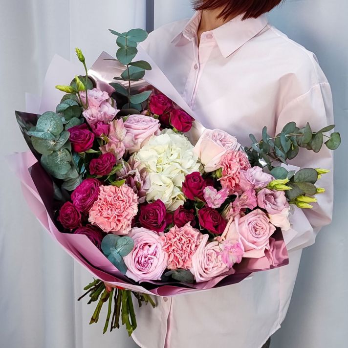 Состав: ранункулюс 7, гортензия 1, альстромерия 5, эустома 2, диантус 5, эвкалипт 1, букетная зелень, упаковка фоамиран, атласная лента.