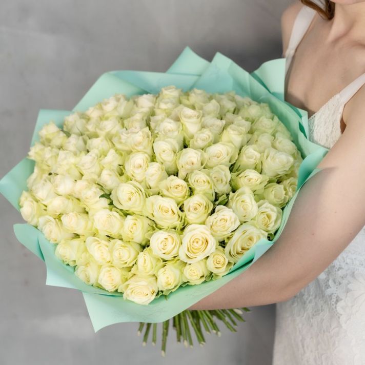 Состав: белая роза Кения 40 см 101, упаковка матовая пленка, атласная лента.