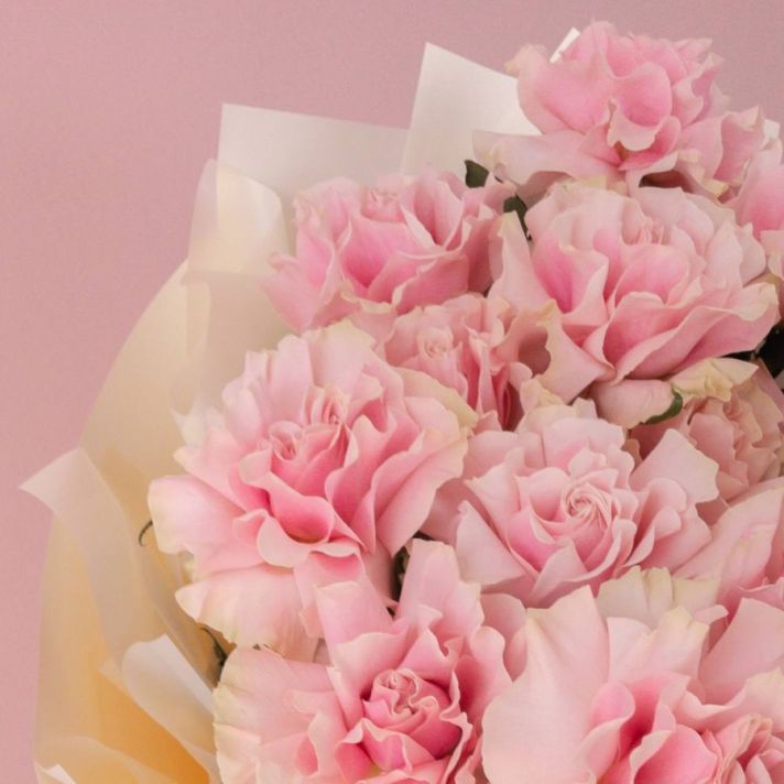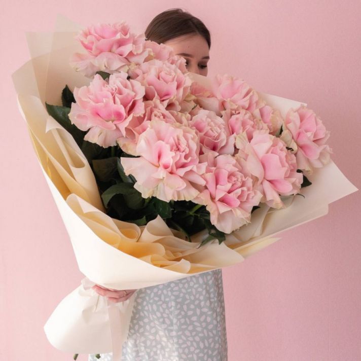 Состав: 15 французских роз, пленка матовая, тишью, лента атласная.