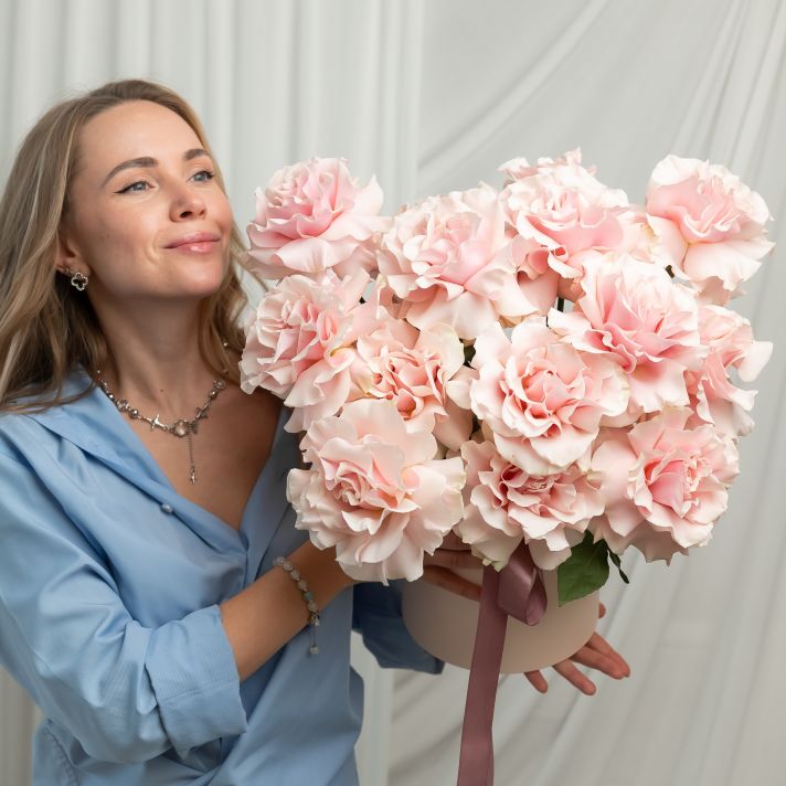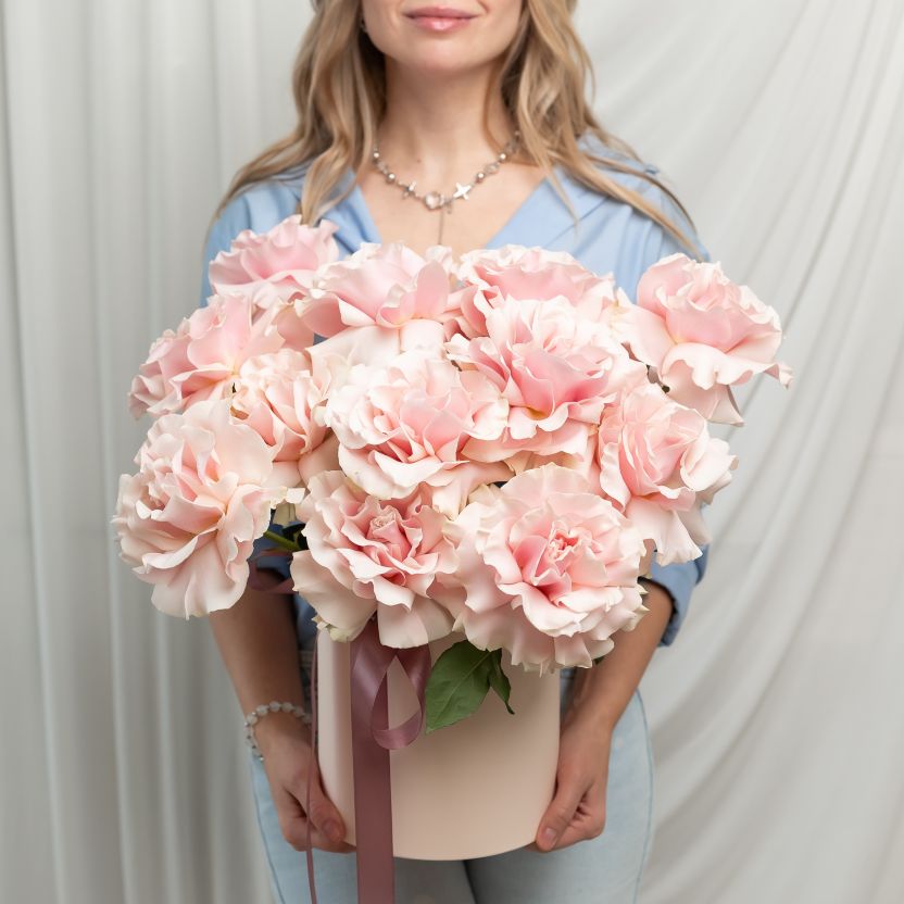 Описание товара "15 французских роз в шляпной коробке (сорт Нина)"