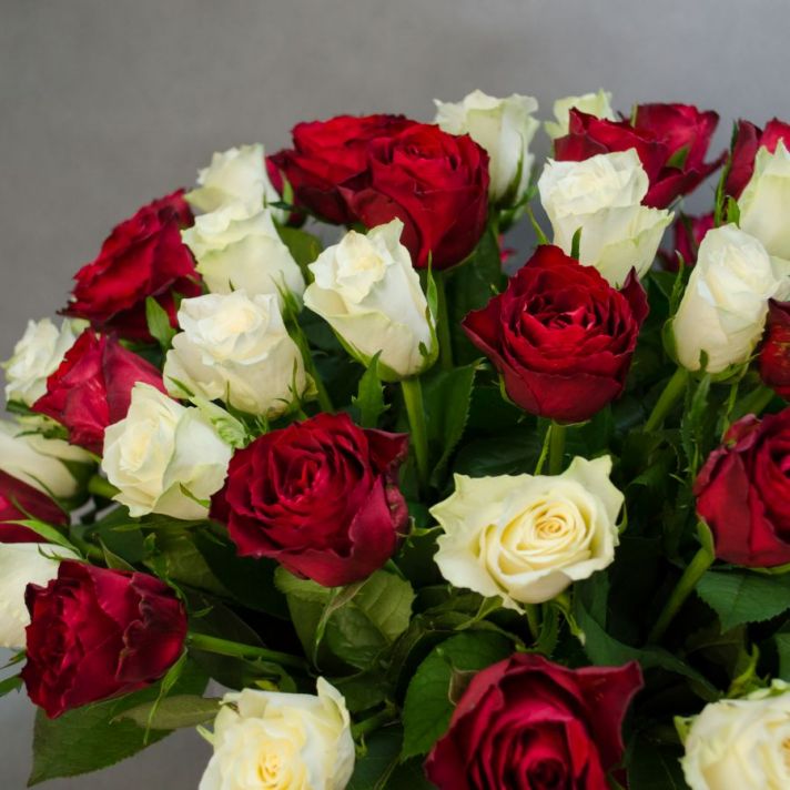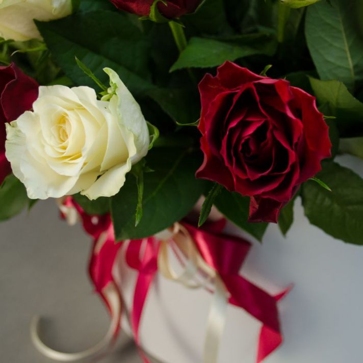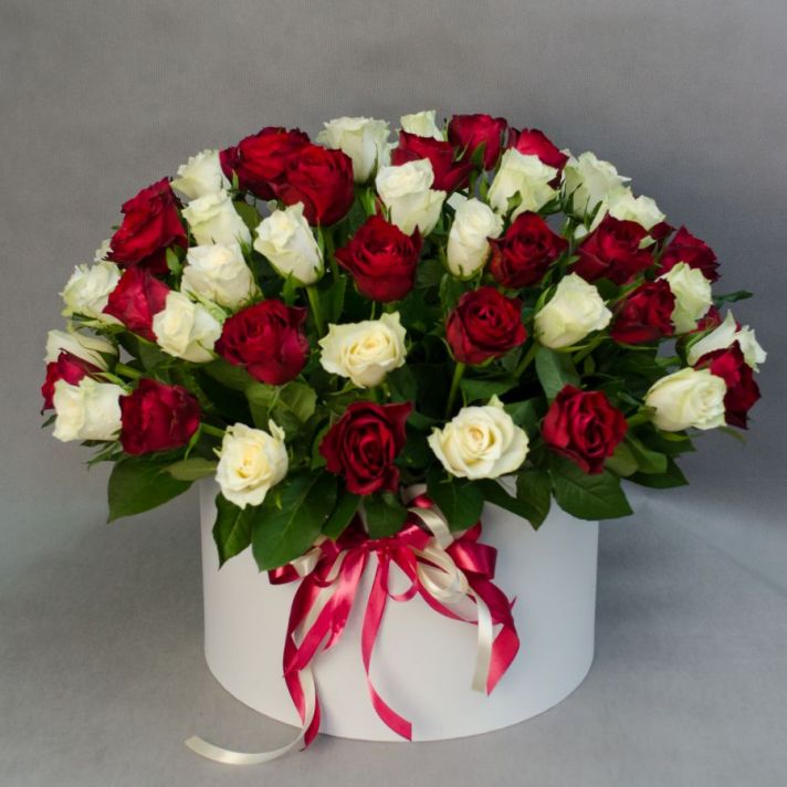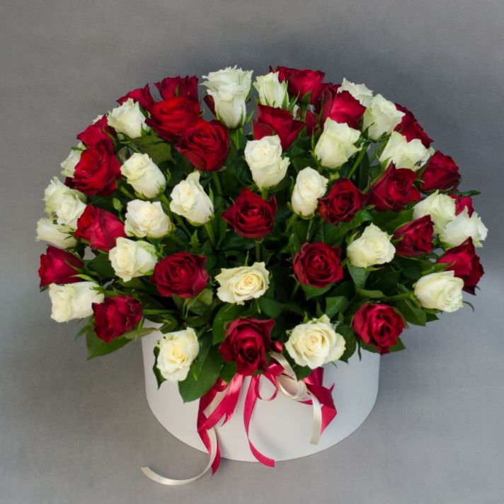 111 красно - белых роз (кенийских) в шляпной коробке Шикарный обьем