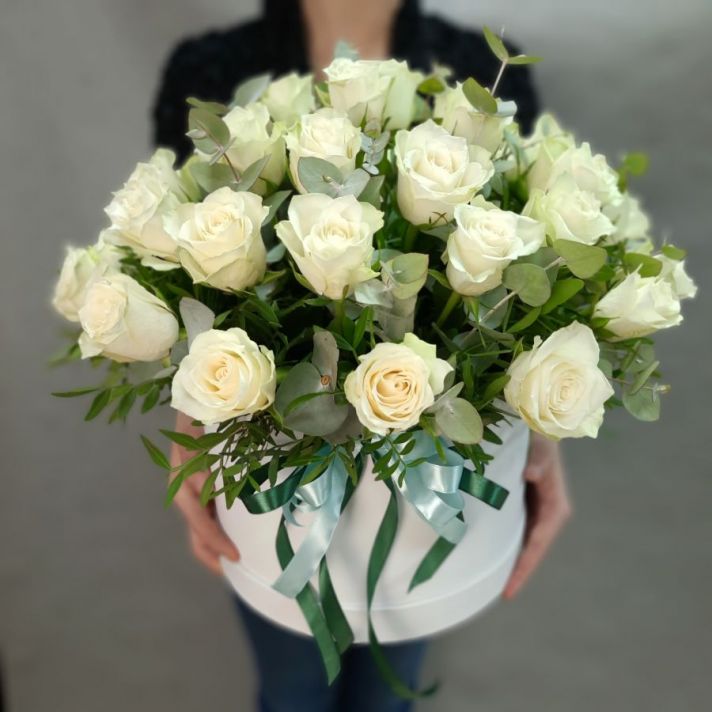 Состав:роза кенийская 35,  букетная зелень, эвкалипт 2, коробка шляпная D 30 см, пиафлор (оазис), атласная лента.