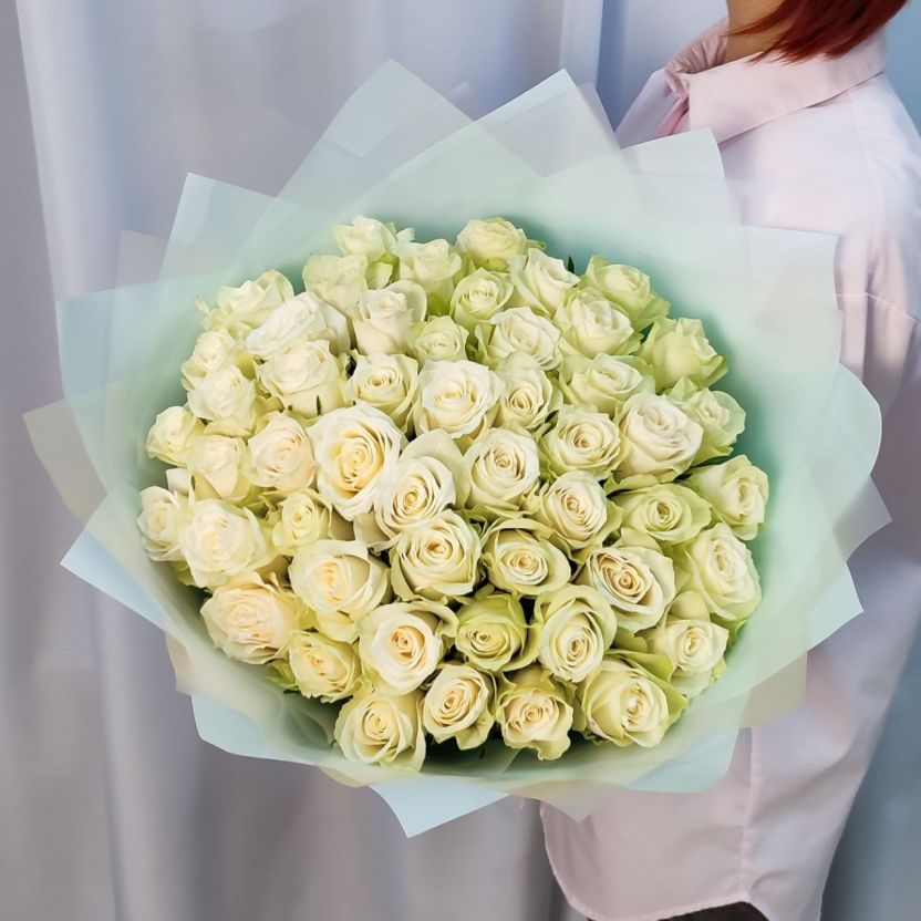 Состав: роза белая 50 см (средний бутон) упаковка матовая пленка, атласная лента.