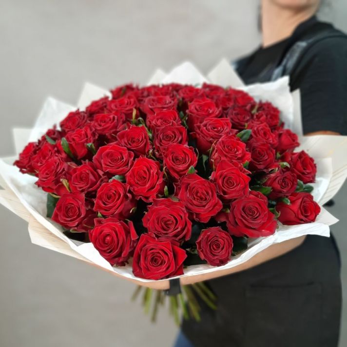 Состав: роза красная 50 см (средний бутон) упаковка матовая пленка, атласная лента.