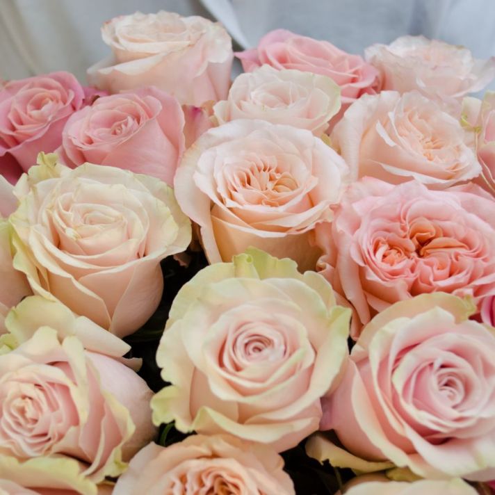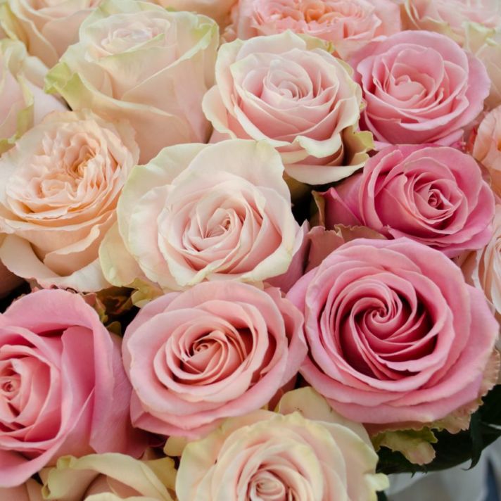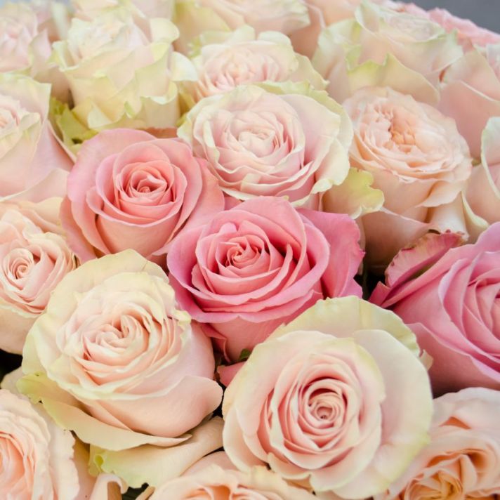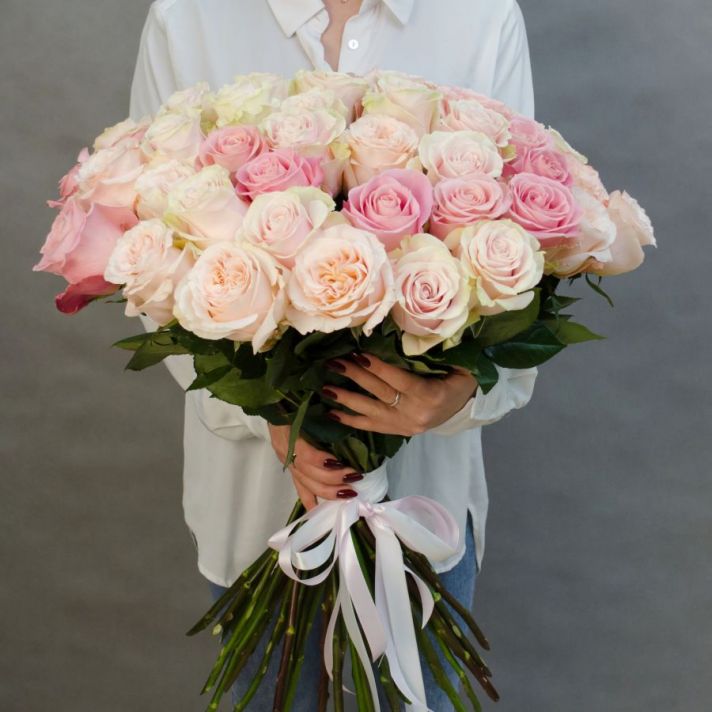 Состав: роза Эквадор 60 см (микс в нежных тонах), атласная лента.