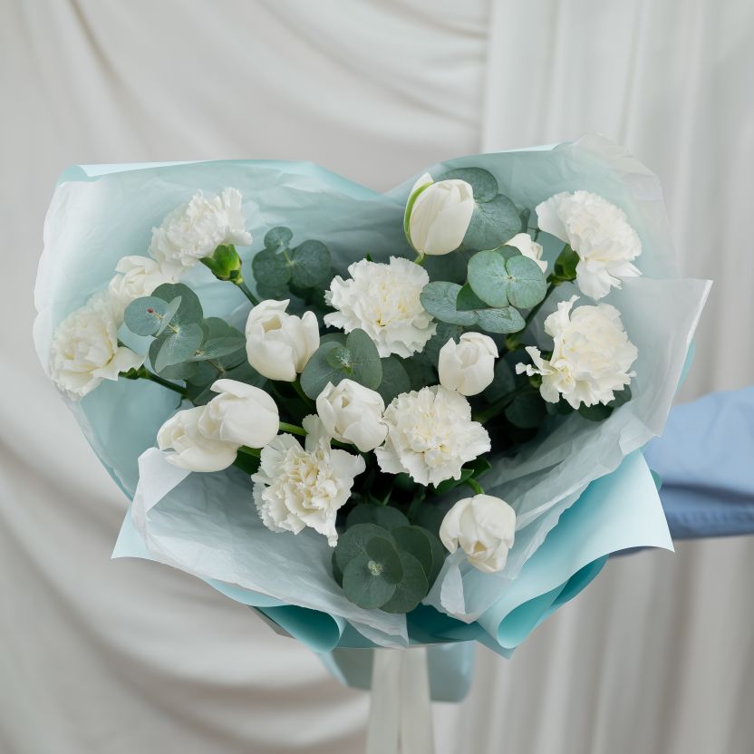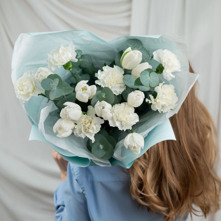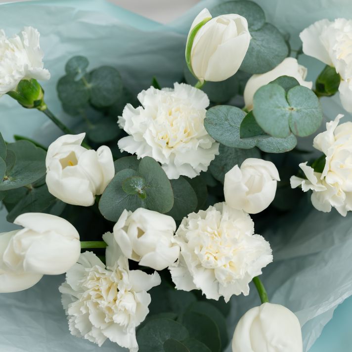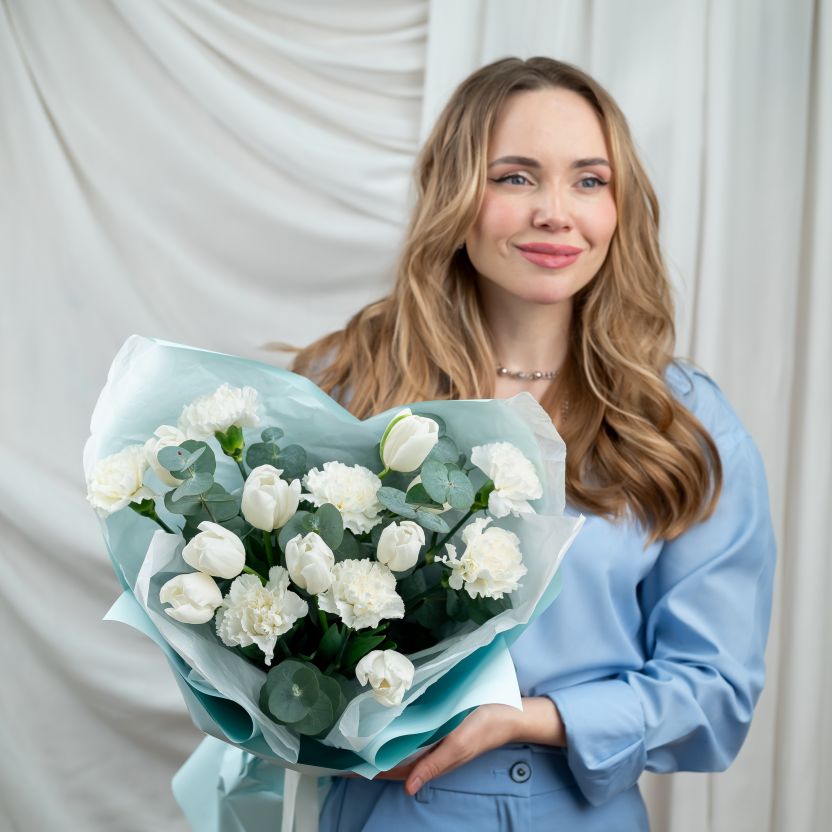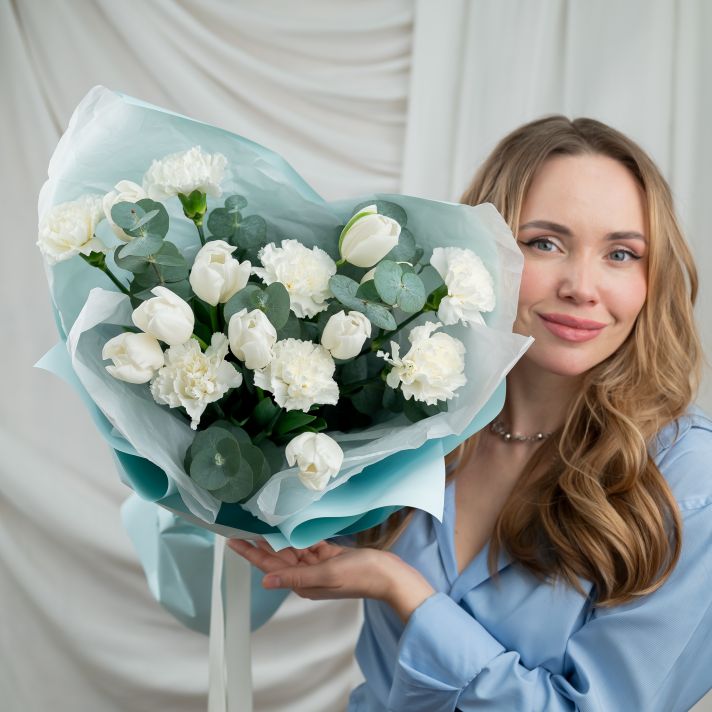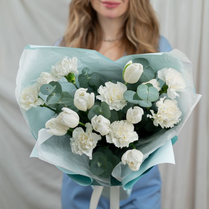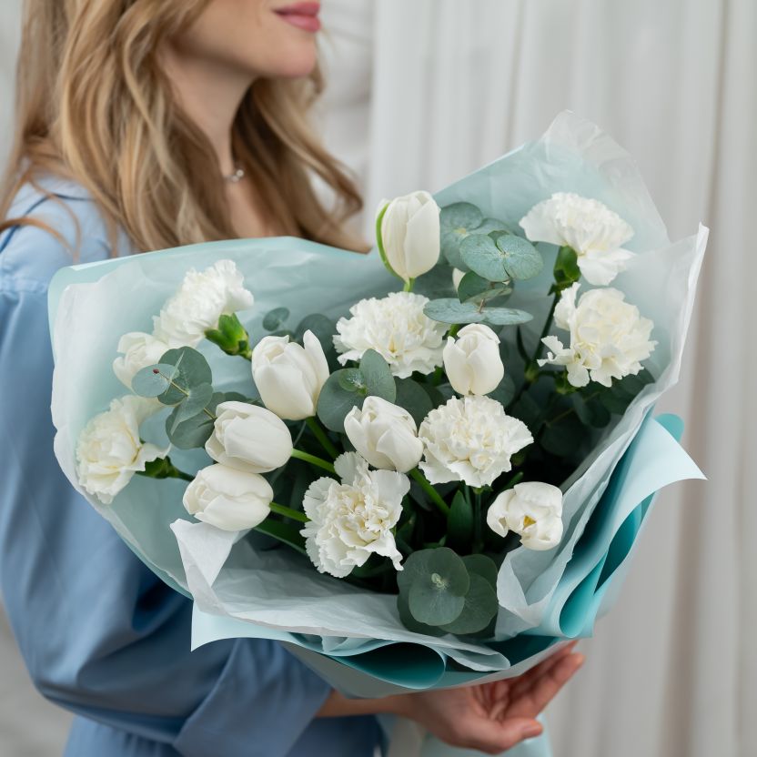Букет в белых тонах из 9 тюльпанов и 7 диантусов