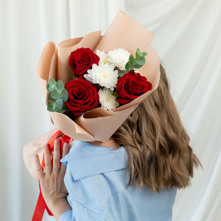 Хризантема - 1/ Роза красная - 2/ Эвкалипт - 1/ Упаковка - 1