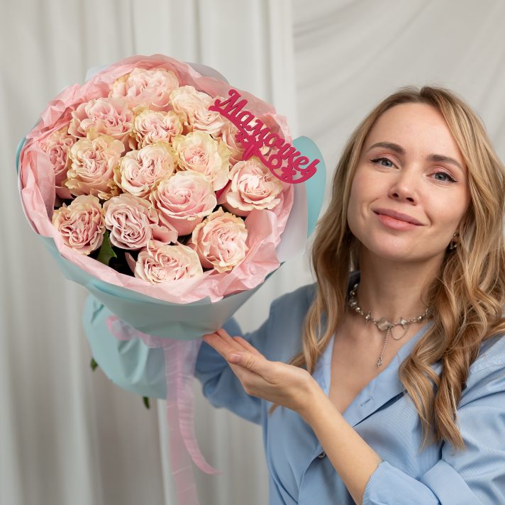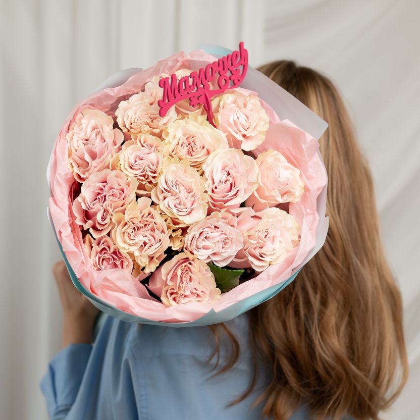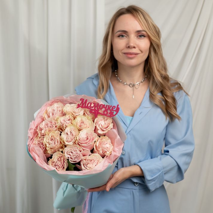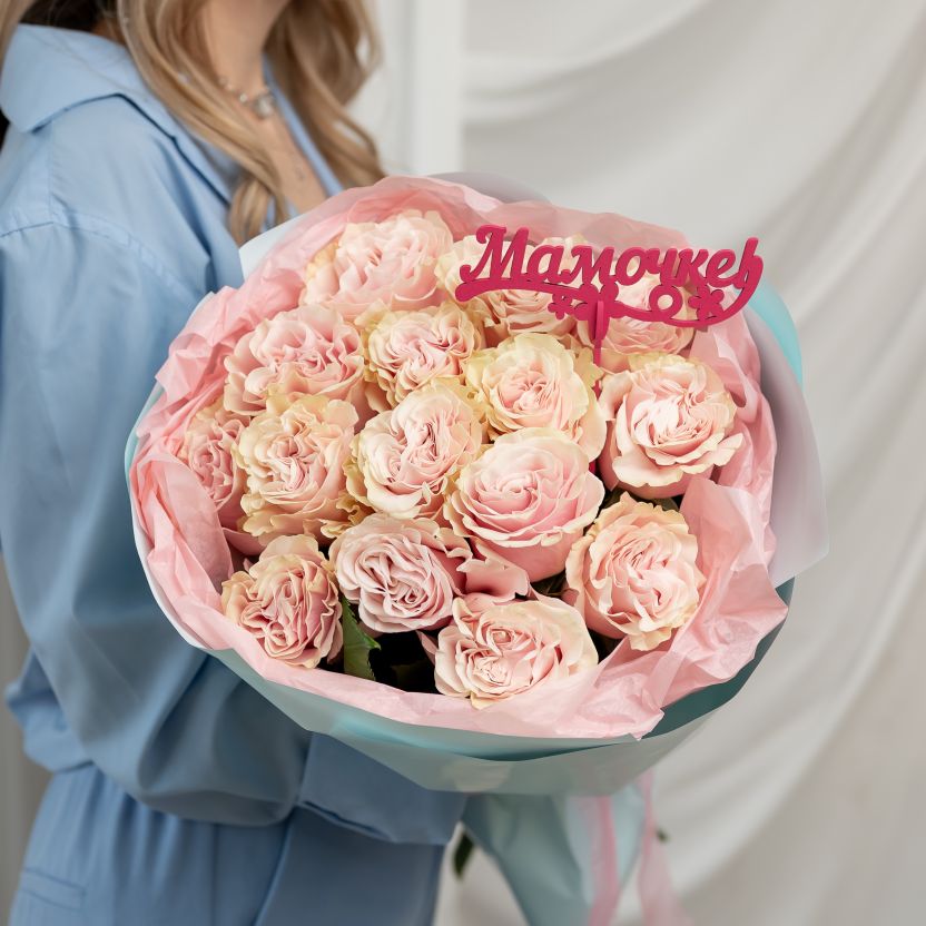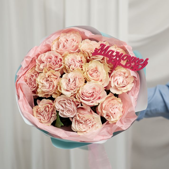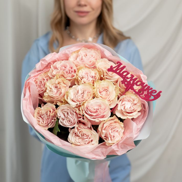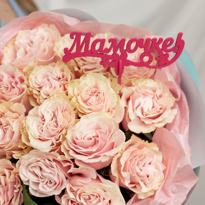 Роза розовая 15 шт Пинк Мондиаль + топпер "Маме"