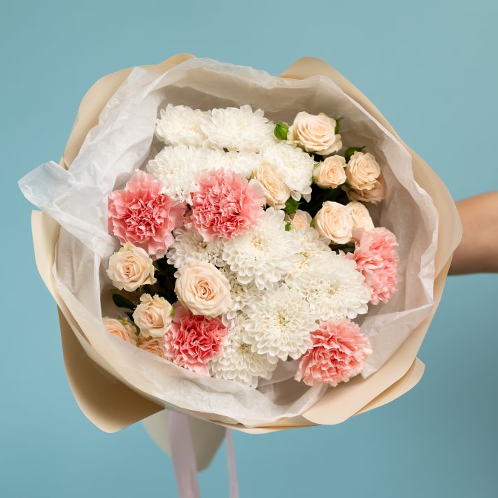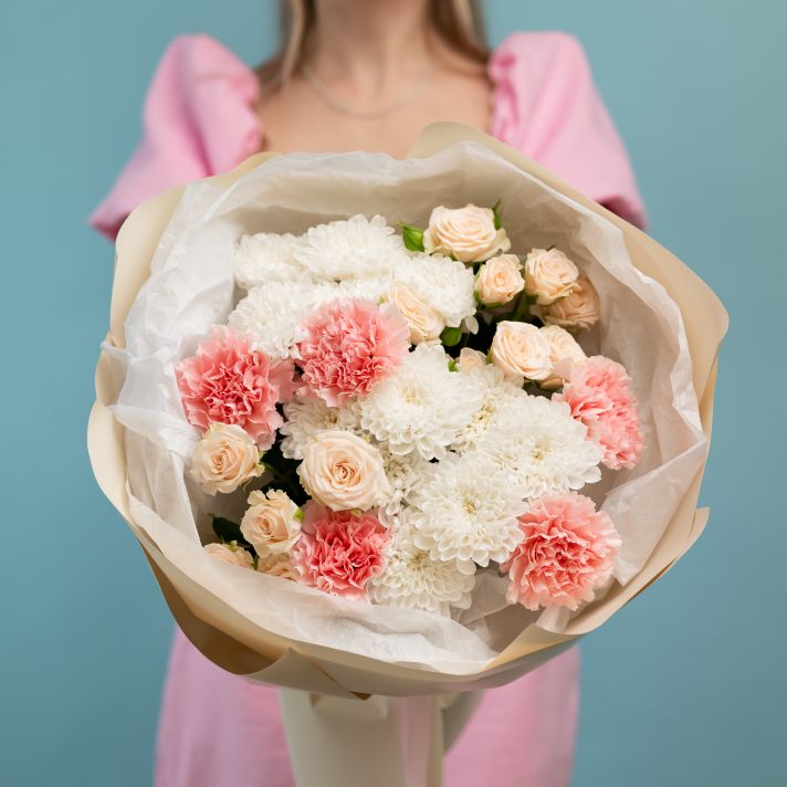 В зависимости от поставки некоторые оттенки цветов и упаковки могут отличаться от исходного фото и могут быть заменены на аналогичные на усмотрение флориста. Цветовая гамма и стилистика букета остаются прежними.