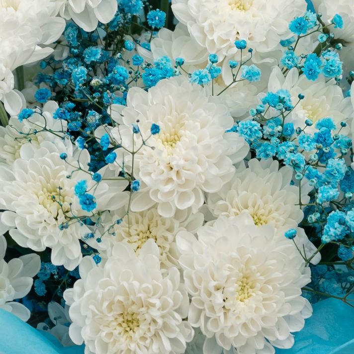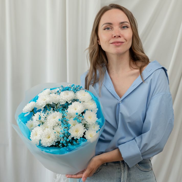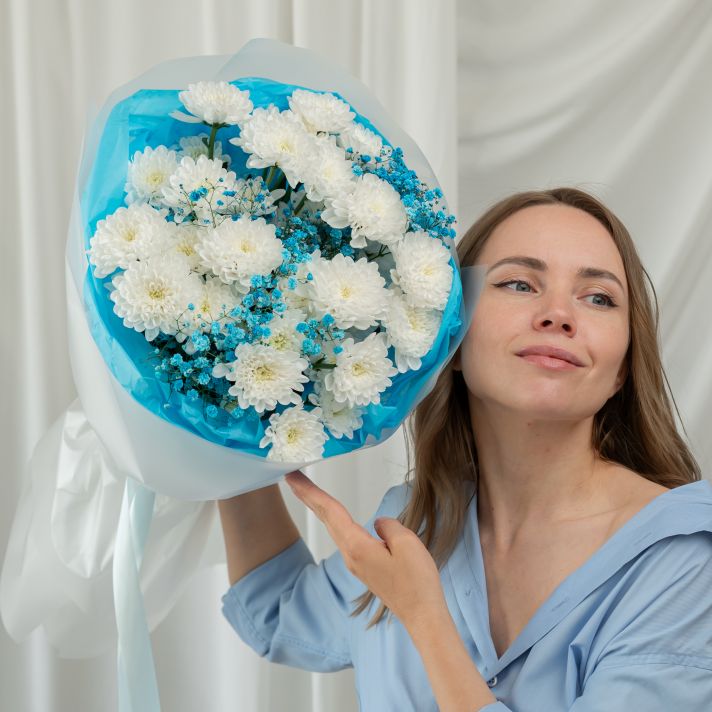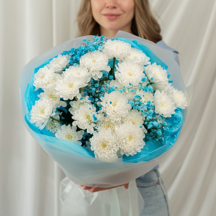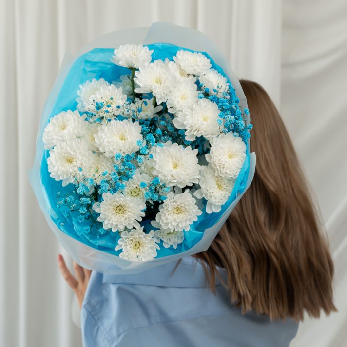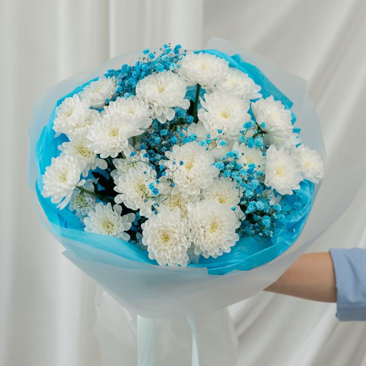 Хризатема - 5 шт / Гипсофила голубая - 2 шт / Упаковка - 1 шт