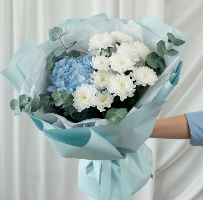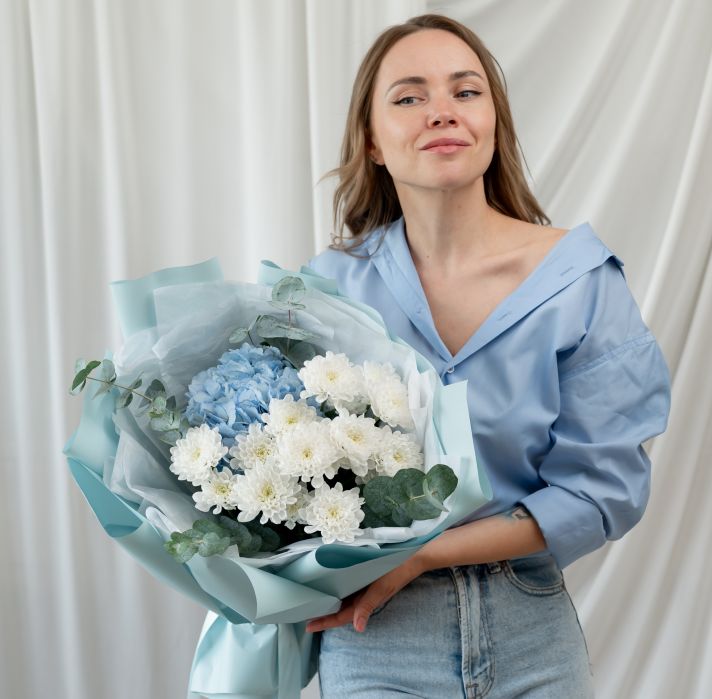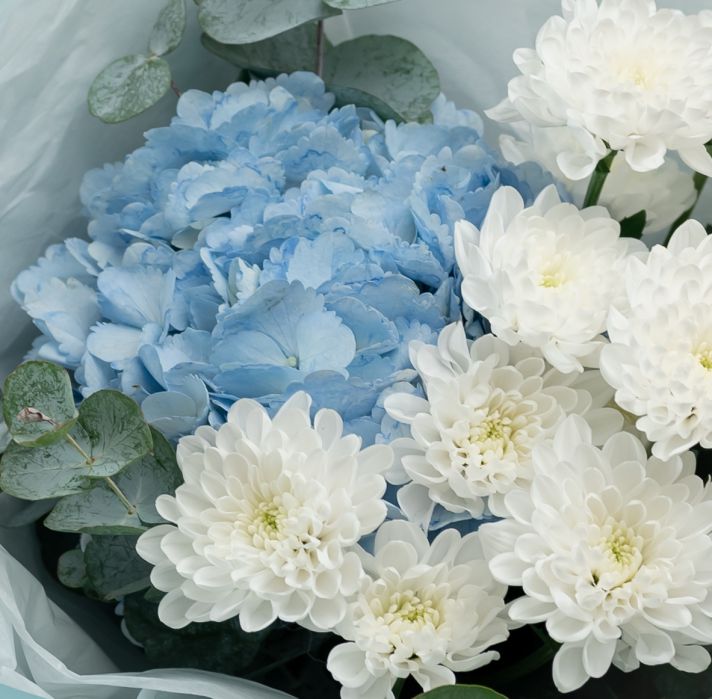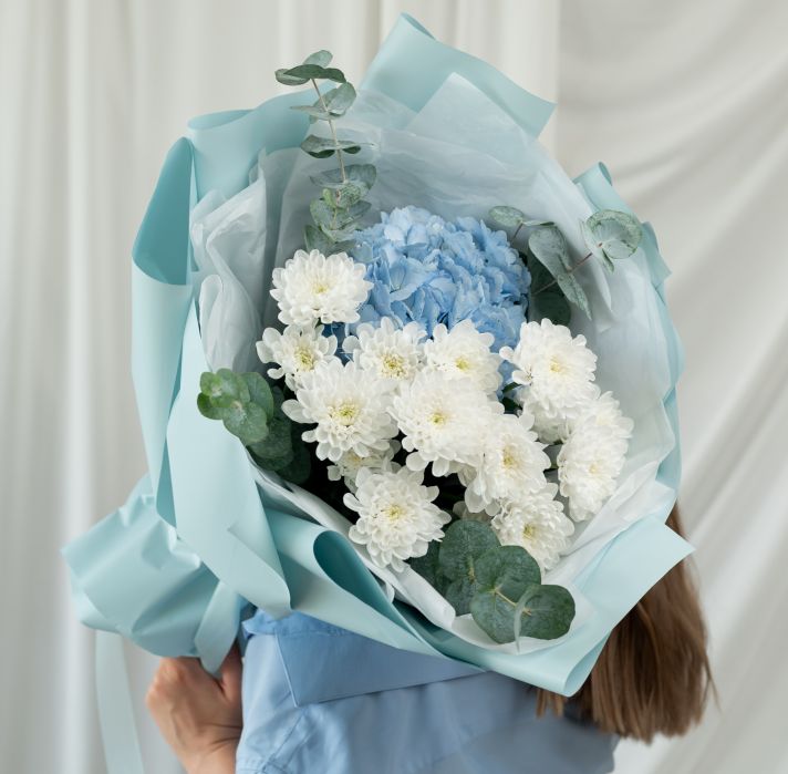 Гортензия - 1 шт / Хризантема - 2 шт / Эвкалипт- 3 шт / Упаковка - 1