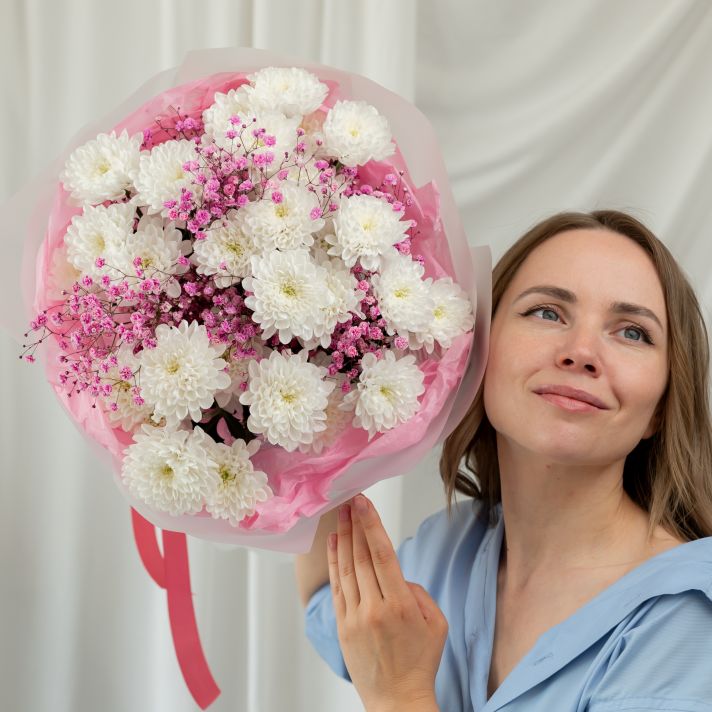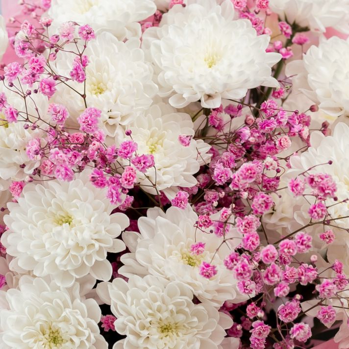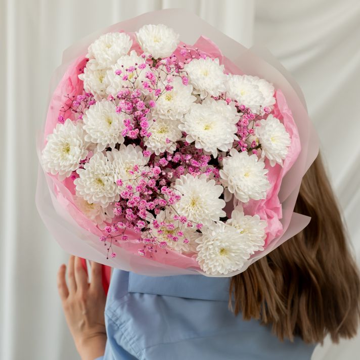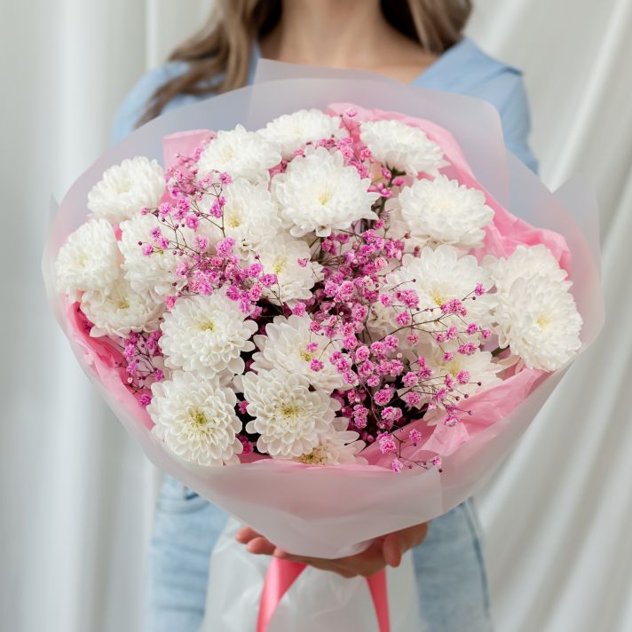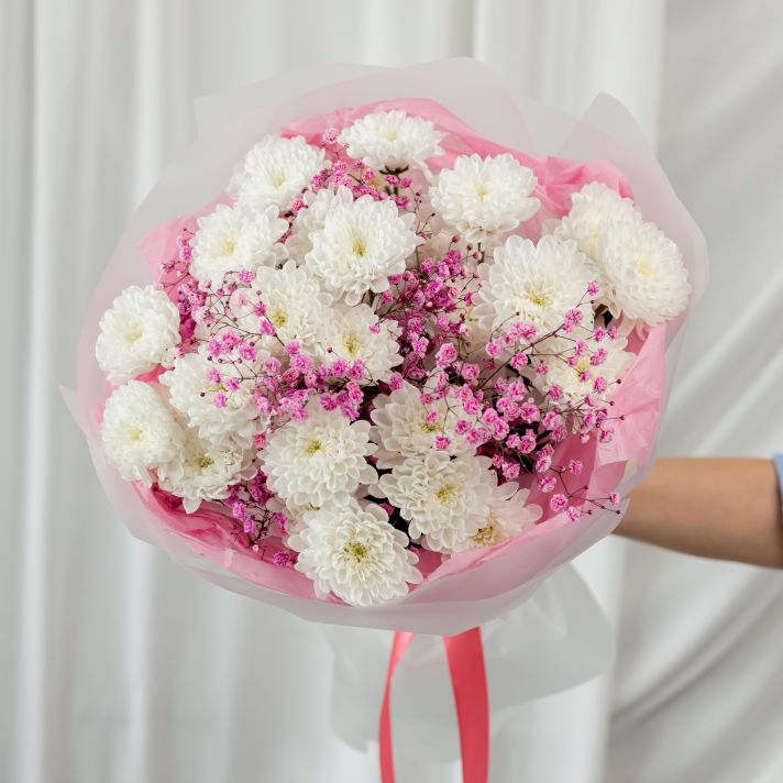 Хризантема - 5 шт / Гипсофила розовая - 2 шт / Упаковка - 1 шт