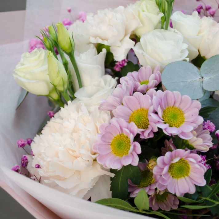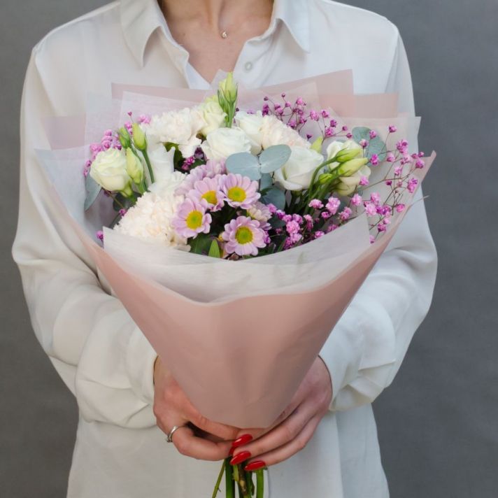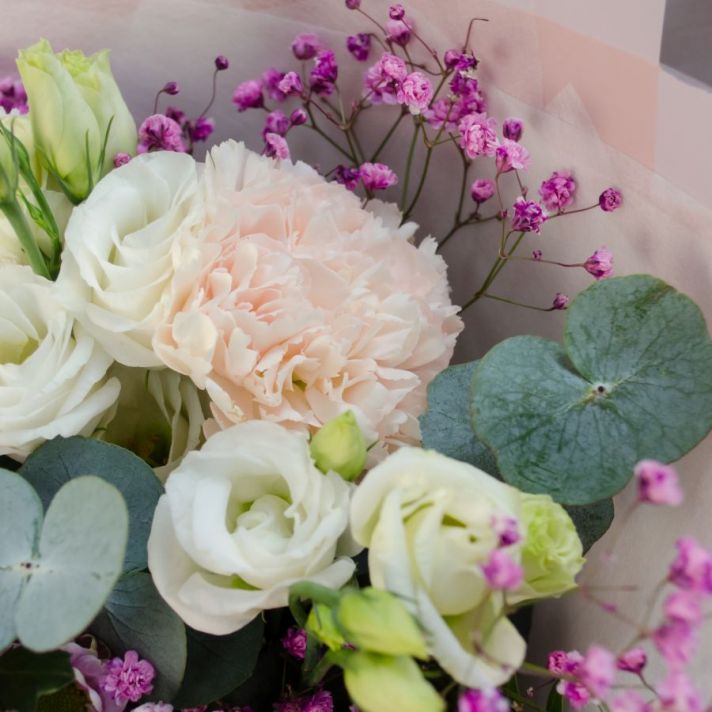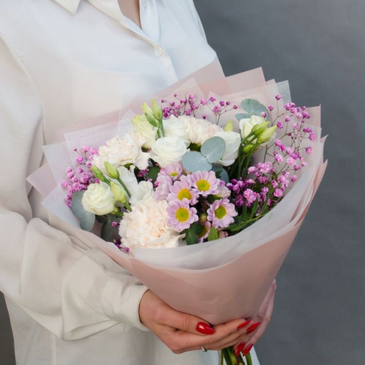Состав: эустома 2, сантини 1, диантус 3, гипсофила 1, эвкалипт , букетная зелень, упаковка матовая пленка, атласная лента.