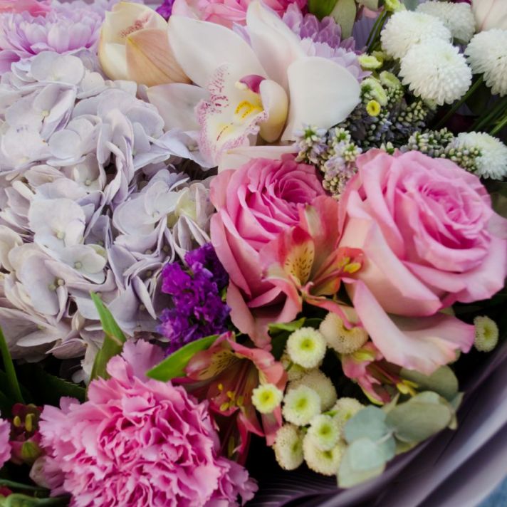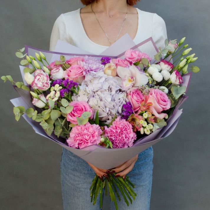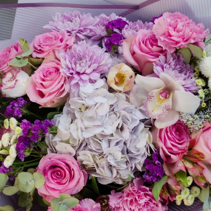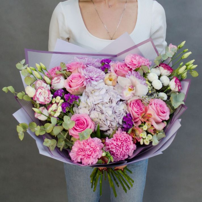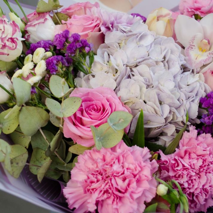 Состав: гортензия 1, роза сортовая 7, орхидея 1, альстромерия 1, танацетум 3, хризантема кустовая 2, эустома 2, статица 2, вероника 1, диантус 3, эвкалипт 1, букетная зелень, упаковка матовая пленка, атласная лента.