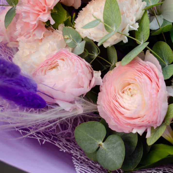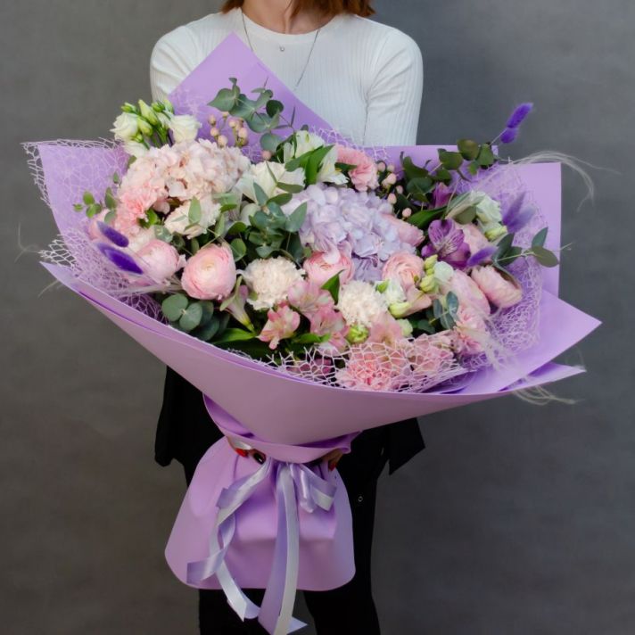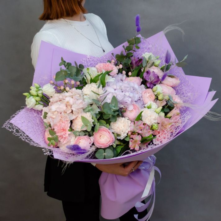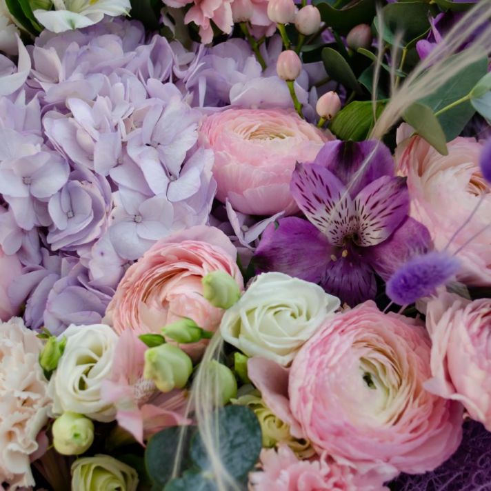 Состав: ранункулюс 9, гортензия 2, эустома 4, диантус 9, альстромерия 5, гиперикум 2, роза кустовая 6, эвкалипт 2, букетная зелень, упаковка фоамиран, атласная лента.