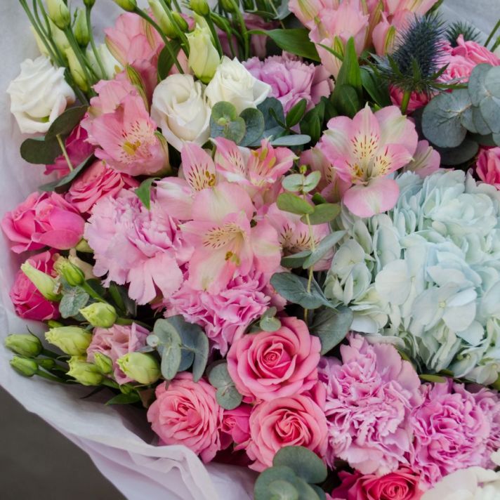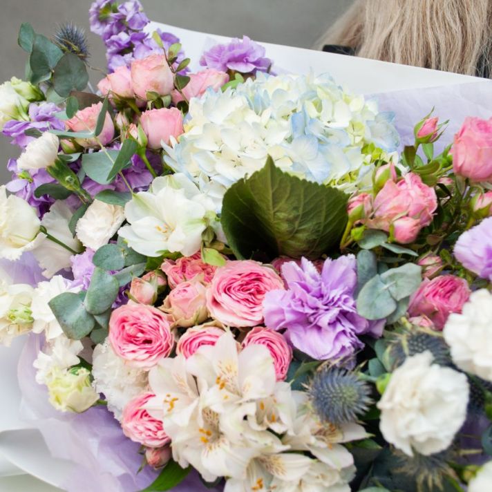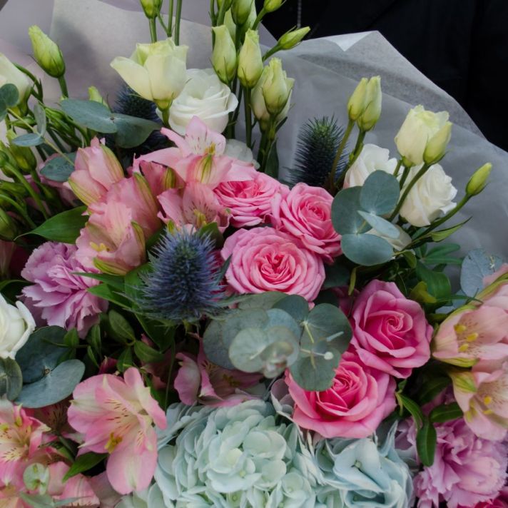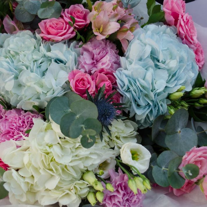 Состав (увеличенный): гортензия 3, матиола 4, роза кустовая пионовидная 5, диантус 7, альстромерия 3, эустома 5, эрингиум 2, эвкалипт 3, упаковка тишью и фоамиран, атласная лента.
