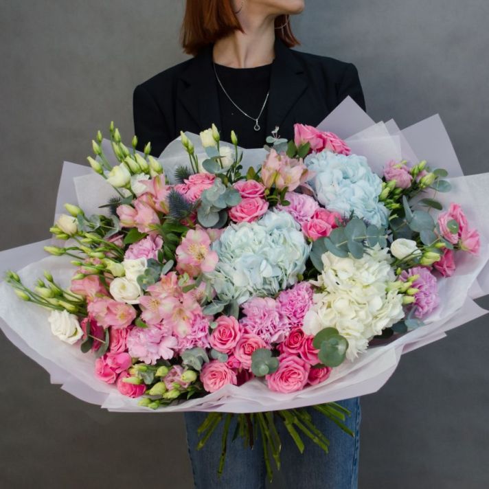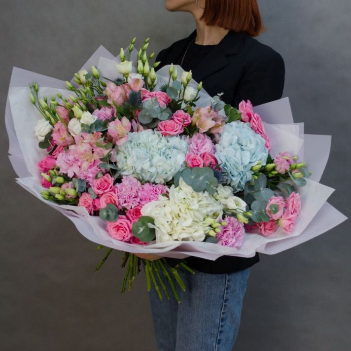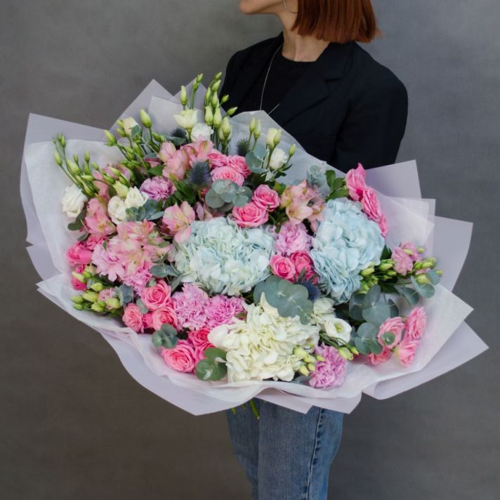 Состав (как на фото): гортензия 1, матиола 2, роза кустовая пионовидная 3, диантус 4, альстромерия 1, эустома 3, эрингиум 1, эвкалипт 2, упаковка тишью и фоамиран, атласная лента.