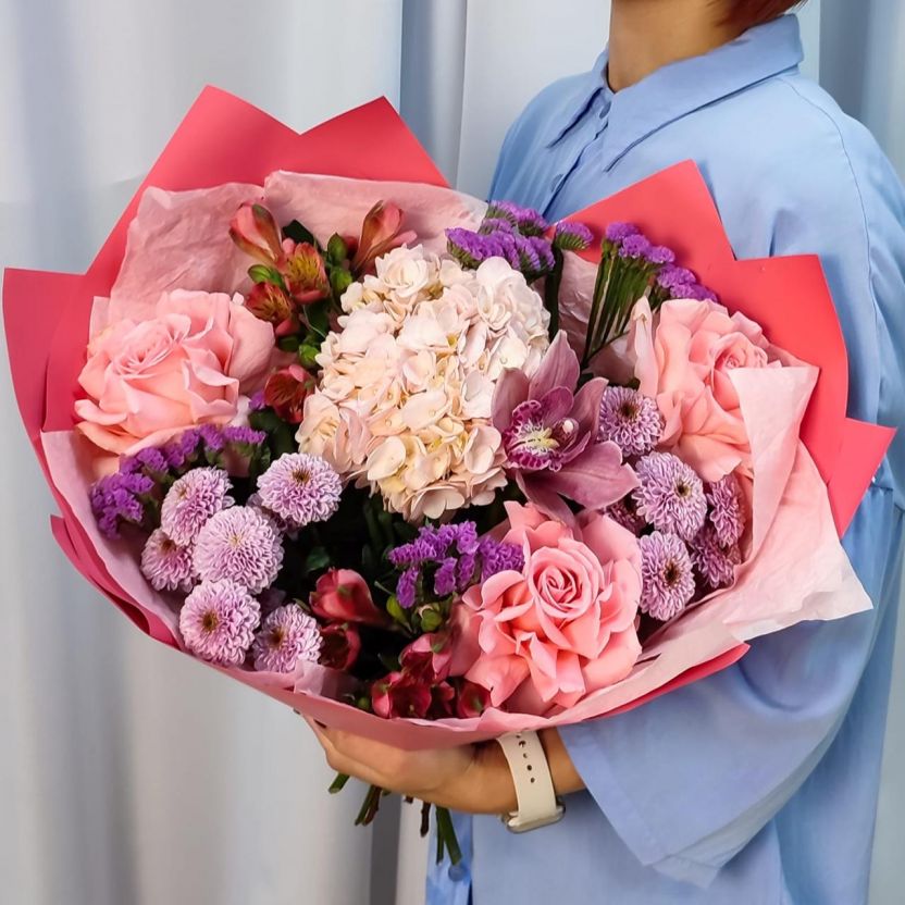 Состав (как на фото) : гортензия 1, роза 5, диантус 5, альстромерия 3, роза кустовая 3,эустома 1, диантус кустовой 2, эвкалипт 2, упаковка матовая пленка, атласная лента.