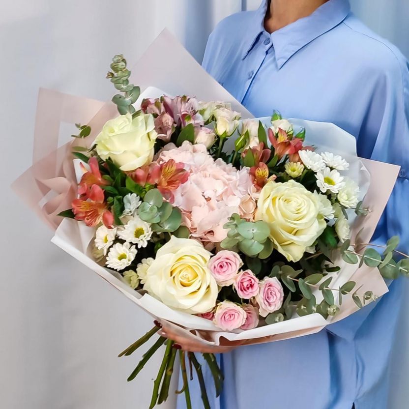 В зависимости от поставки некоторые оттенки цветов и упаковки могут отличаться от исходного фото и могут быть заменены на аналогичные на усмотрение флориста. Цветовая гамма и стилистика букета остаются прежними.