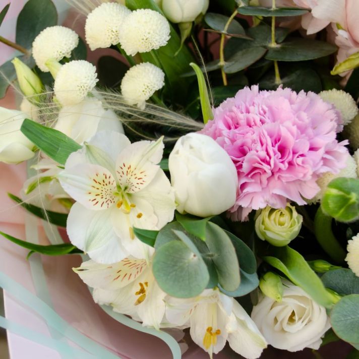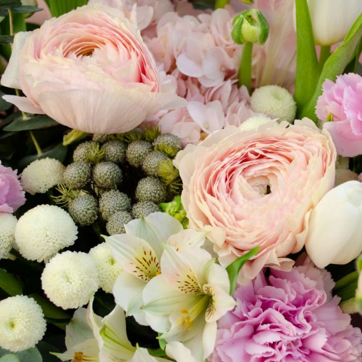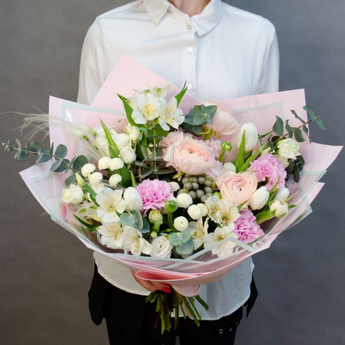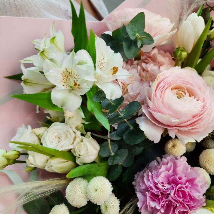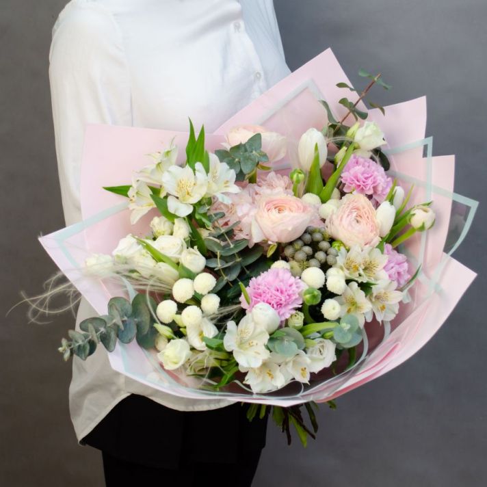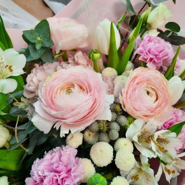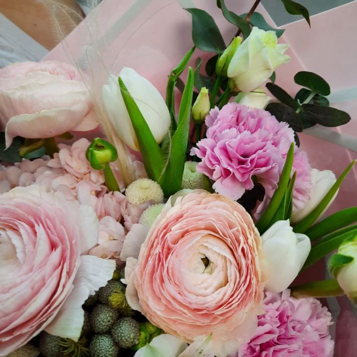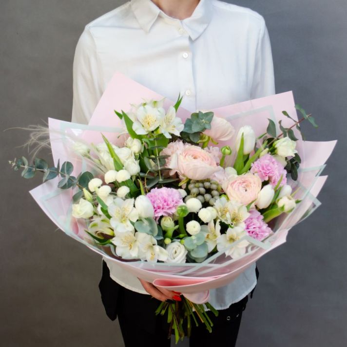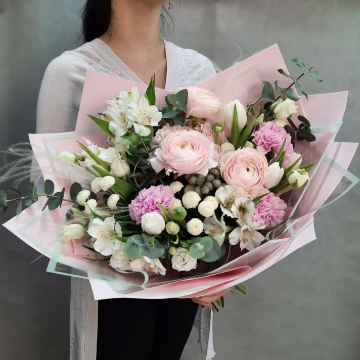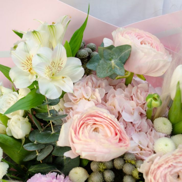 Состав: ранункулюс 3, гортензия 1, бруния Левис 2, альстромерия 3, хризантема сантини 3, эустома 1, диантус 3, тюльпан 5, роза кустовая 1, эвкалипт, букетная зелень,упаковка матовая пленка, атласная лента.