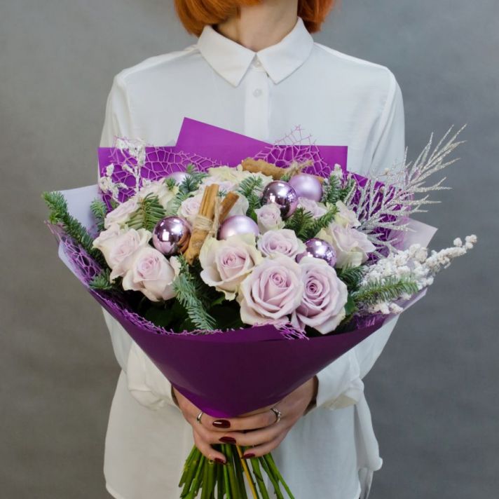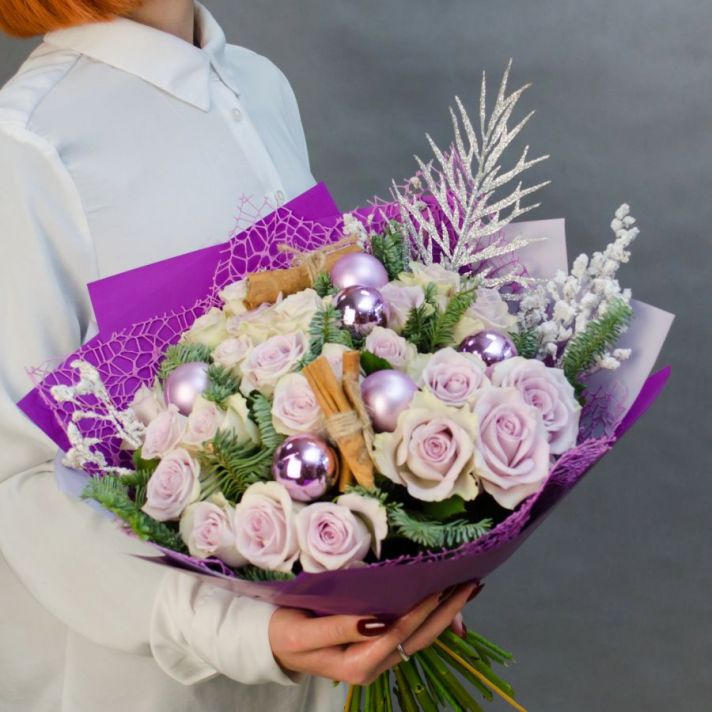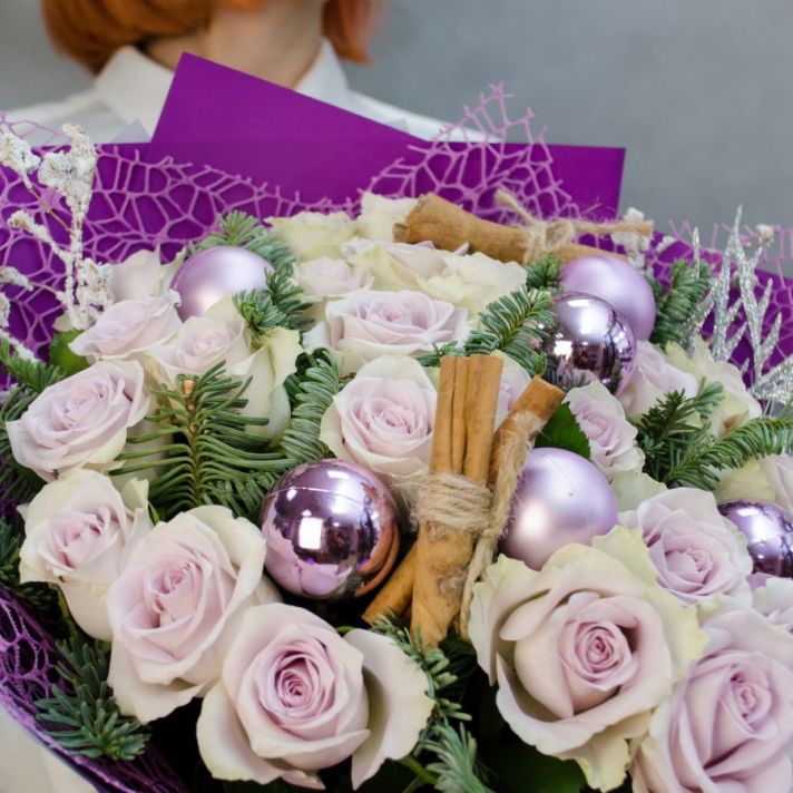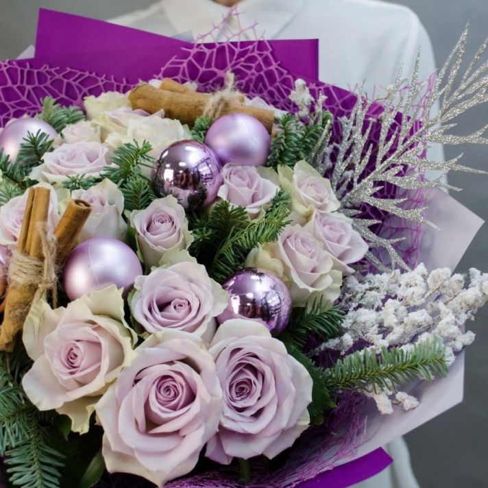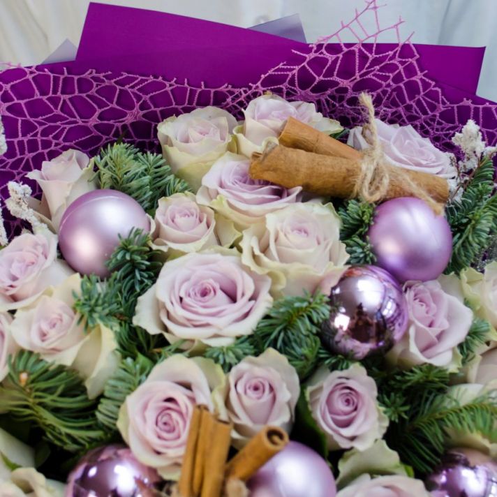 Состав: нобилис (датская ель), кенийская роза 25, новогодний шар 6, корица 4,  декоративные элементы, упаковка матовая пленка, атласная лента.