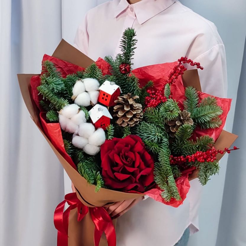 В зависимости от поставки некоторые оттенки декоративных элементов могут отличаться от исходного фото и могут быть заменены на аналогичные на усмотрение флориста. Цветовая гамма и стилистика букета остаются прежними.
