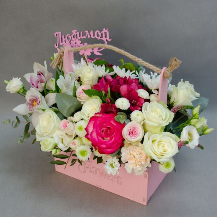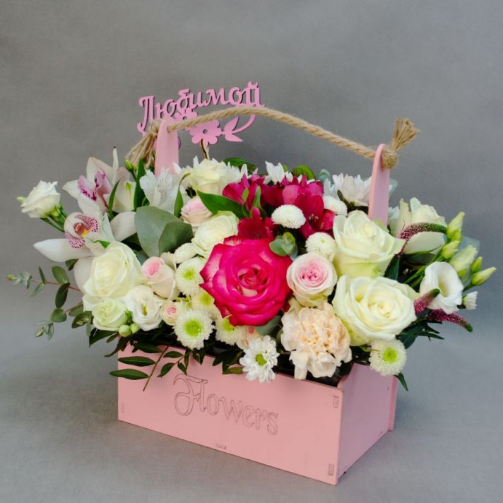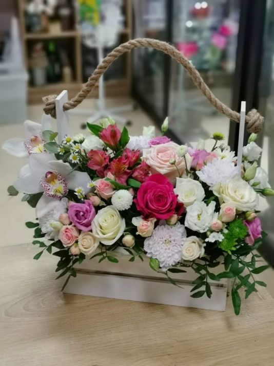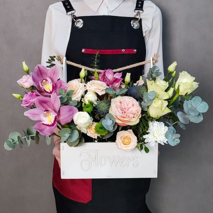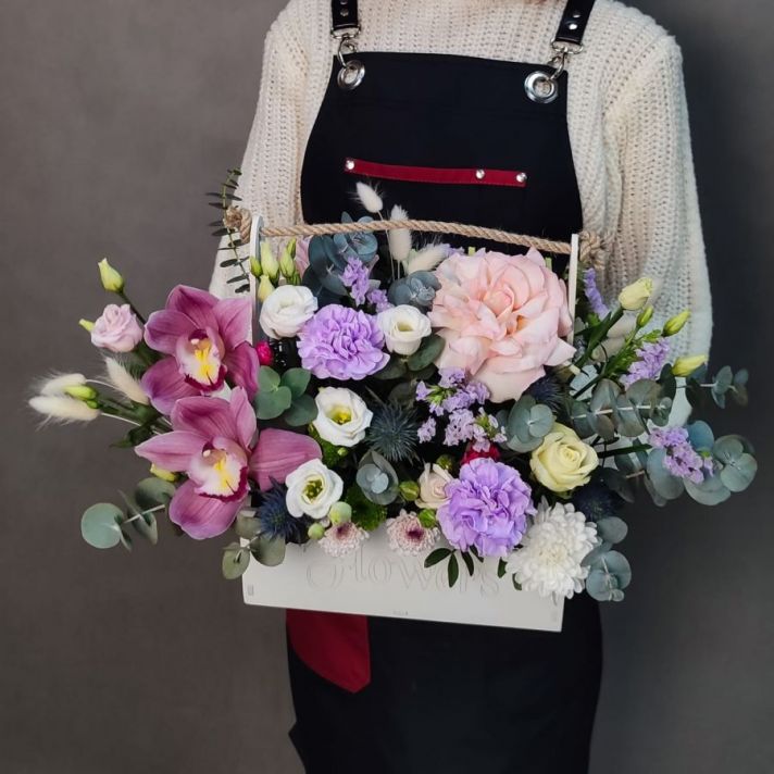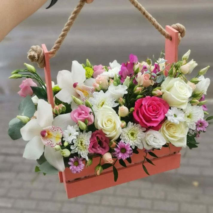 Состав: роза кенийская, орхидея, альстромерия, сантини, роза кустовая, эустома, диантус, зелень букетная, пиафлор (оазис), ящик цветочный 24*15 см , атласная лента (на фото ящик в размере 25*15 см)