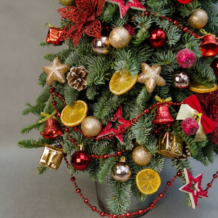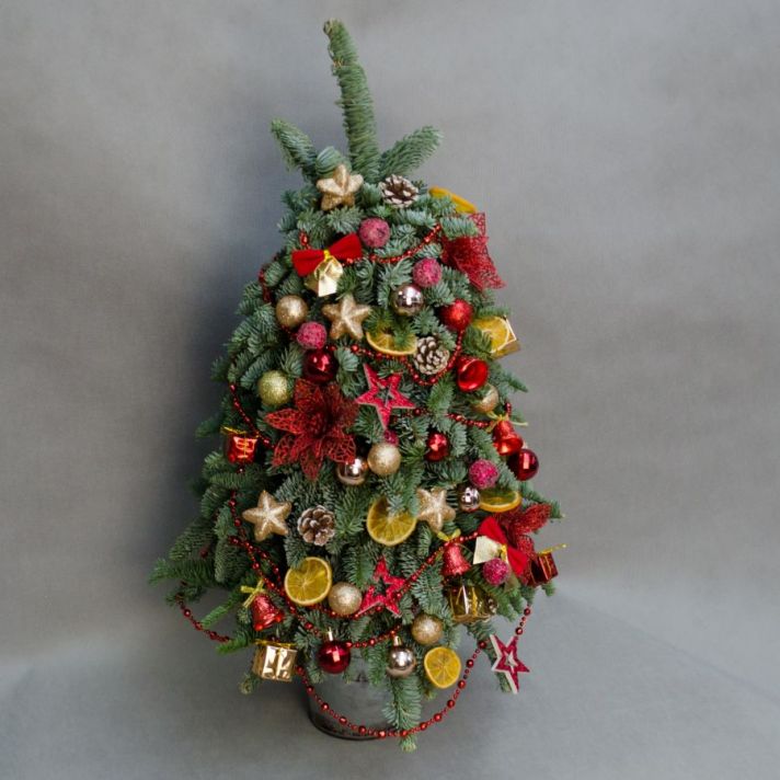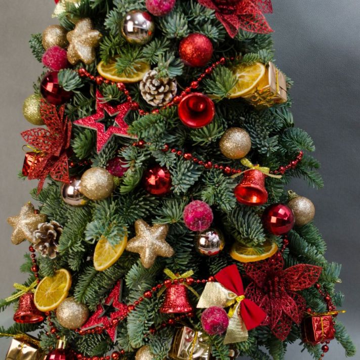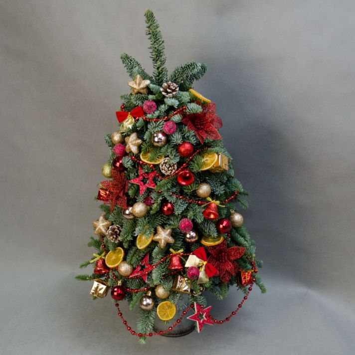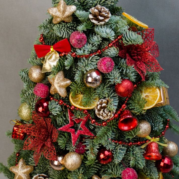 Елочка из нобилиса (нормандская ель) с красными и золотыми шарами, новогодним декором, шишками и дольками апельсина. Размер большой (65см).