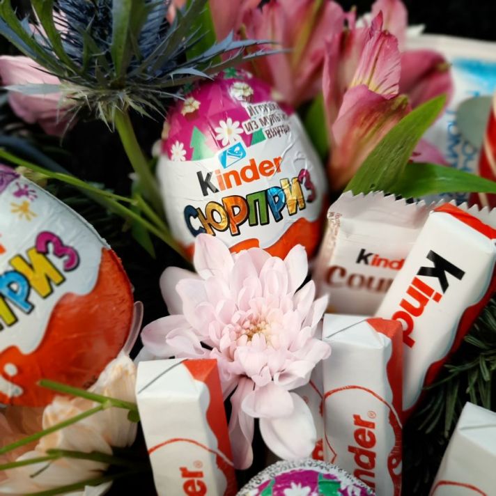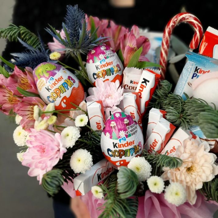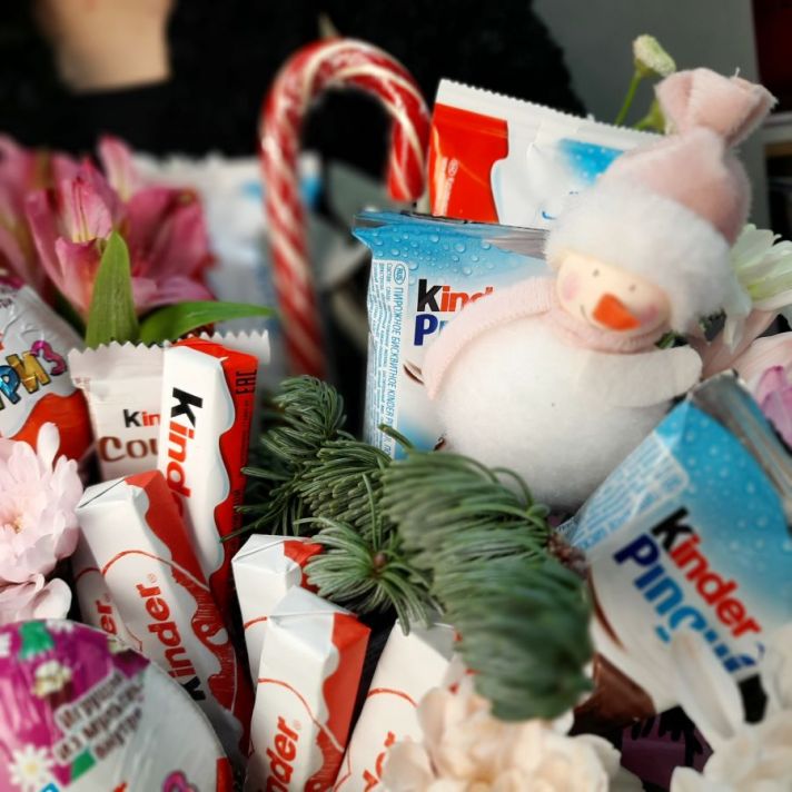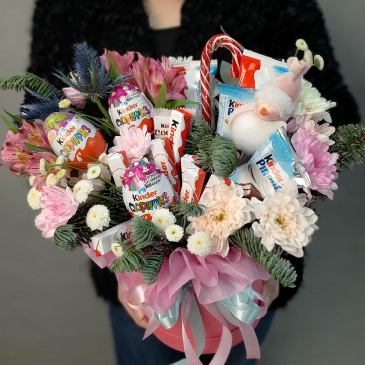 Состав: нобилис (датская ель), хризантема кустовая 1, альстромерия 2, шоколадное яйцо 3, сладости киндер в ассортименте, новогодний декор, пиафлор (оазис), подарочная коробка