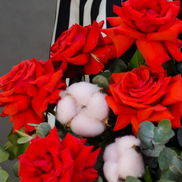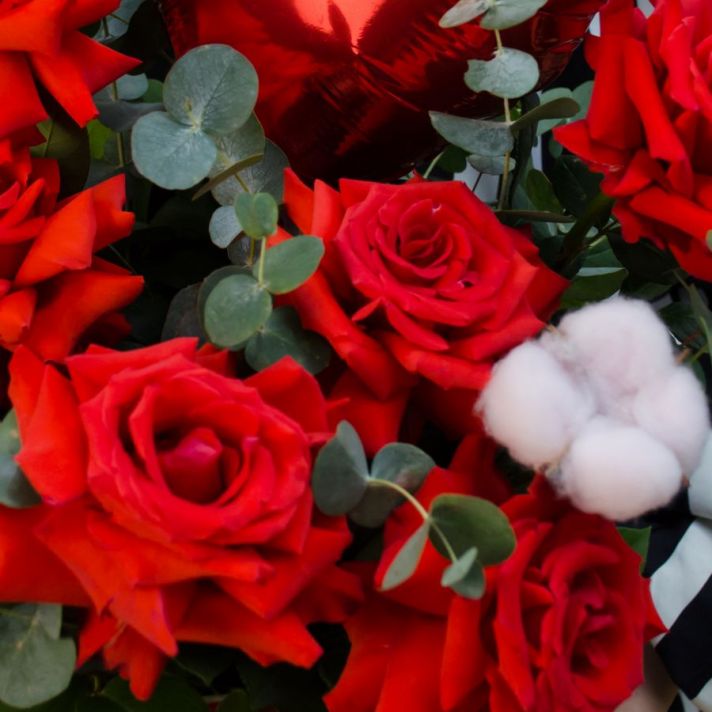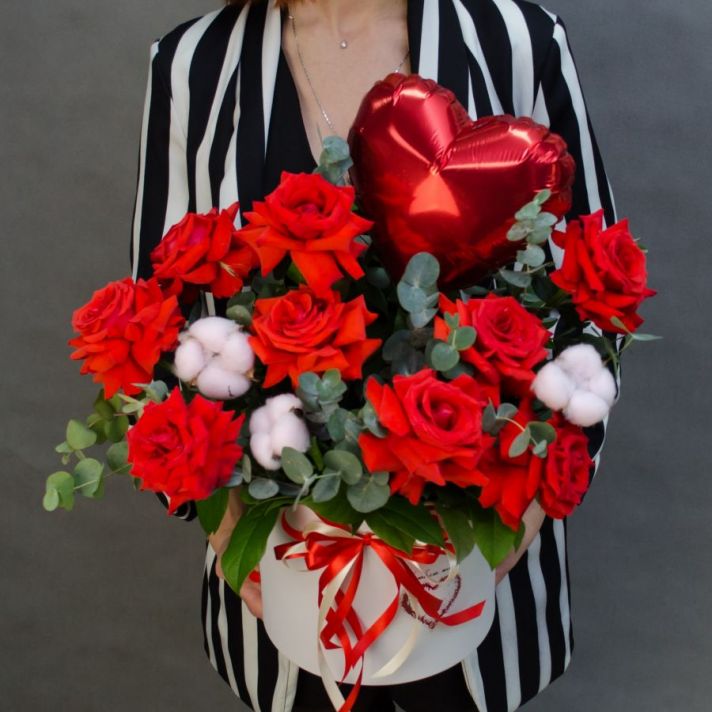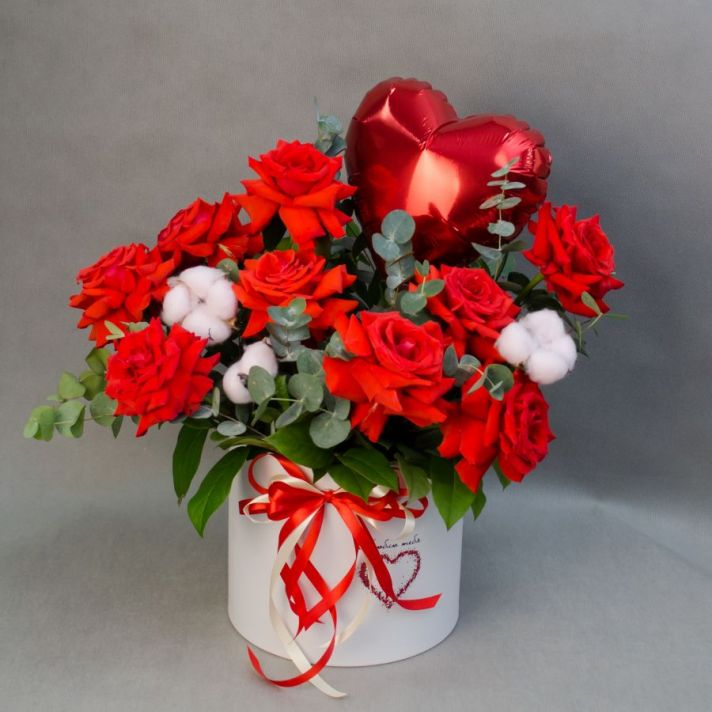 Состав: роза французская 9, хлопок 3, эвкалипт, серце фольга 1, коробка шляпная 1, пиафлор оазис 1, атласная лента.