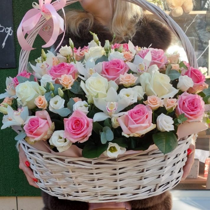 • Композиция в корзине, состав: розы, розы кустовые, диантусы, орхидея, эустома, эвкалипт