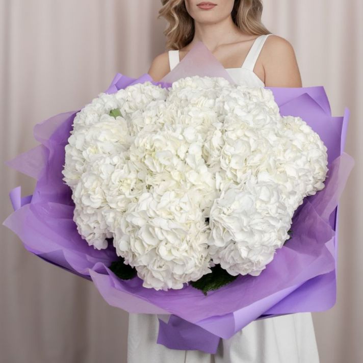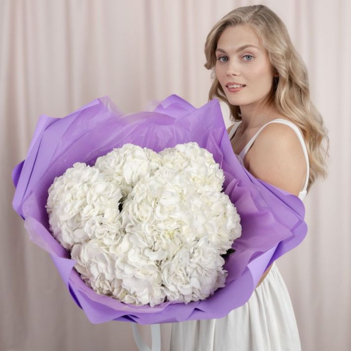 Состав букета: гортензия белая (количество можно выбирать), упаковка матовая пленка, атласная лента.