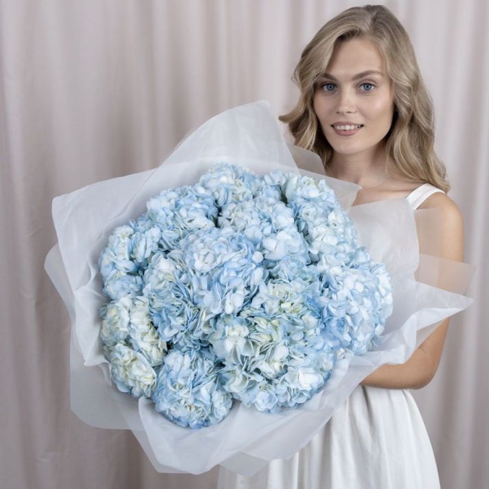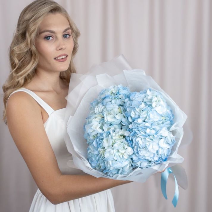 Состав букета: гортензия голубая (количество можно выбирать), упаковка матовая пленка, атласная лента.