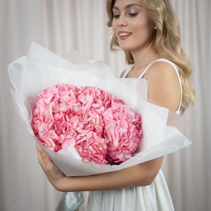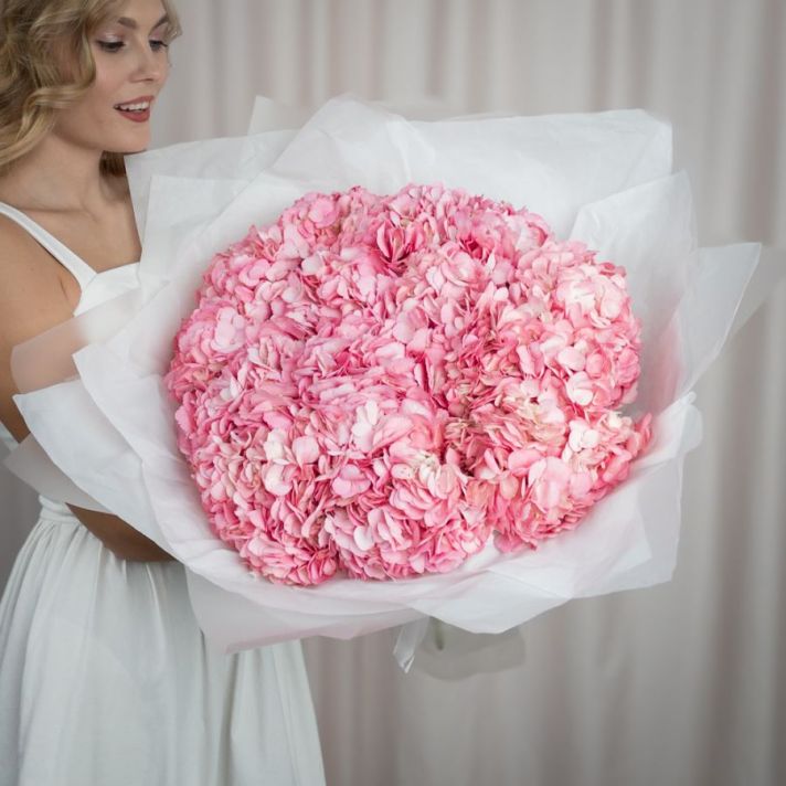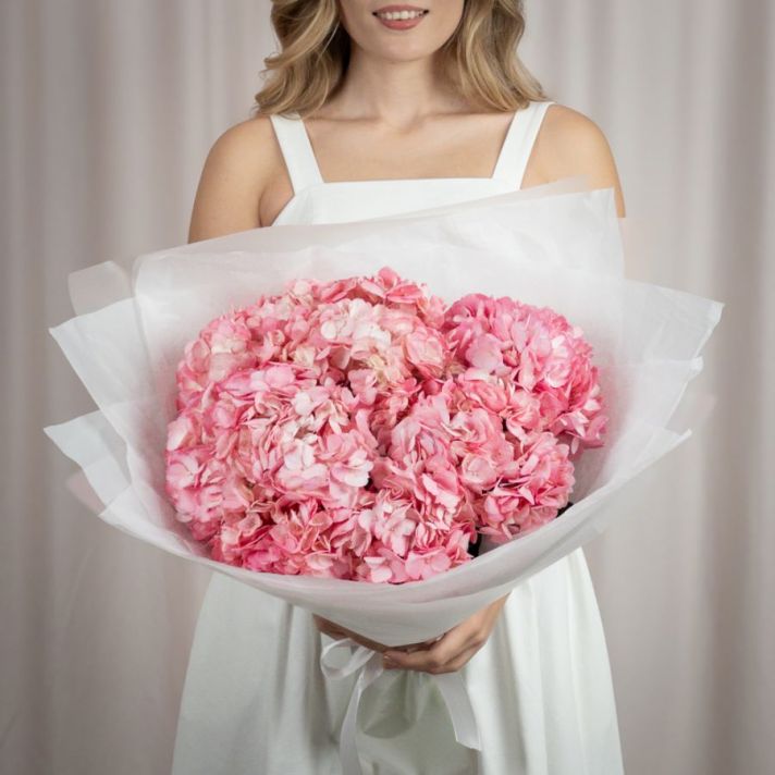 Состав букета: гортензия розовая (количество можно выбирать), упаковка матовая пленка, атласная лента.