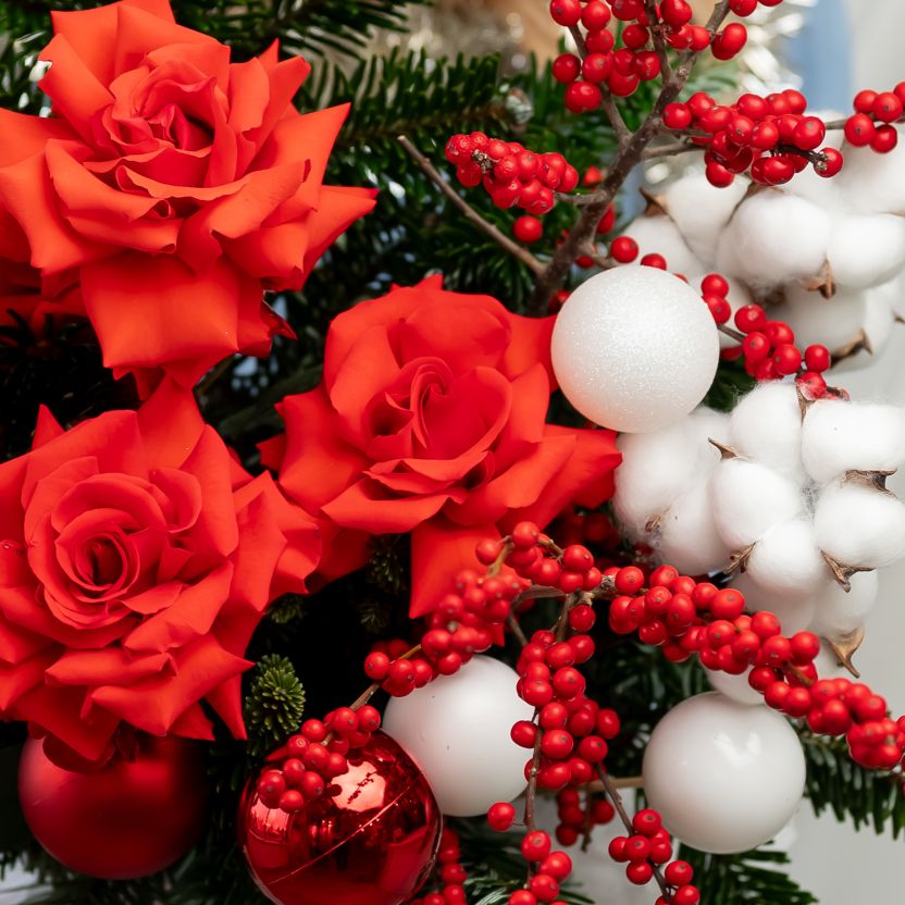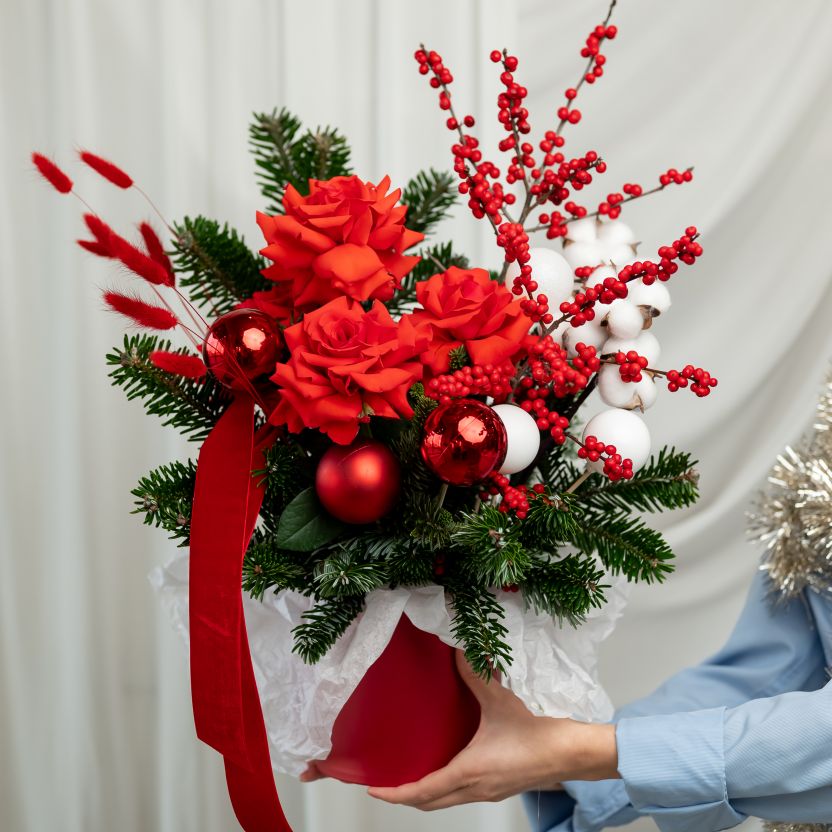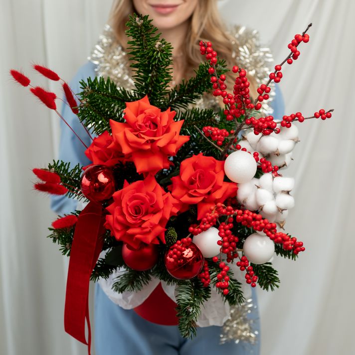 Коробка бархатная - 1шт, оазис - 1шт, нобилис - 1шт, илекс - 2шт, французская роза - 3шт, лагурус - 8 шт, хлопок - 4шт, шар - 6шт, лента - 1 шт.