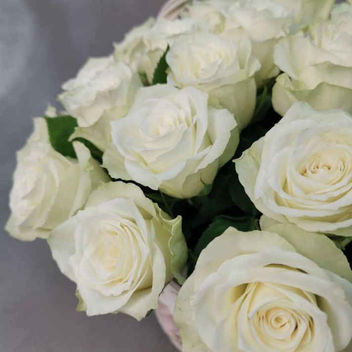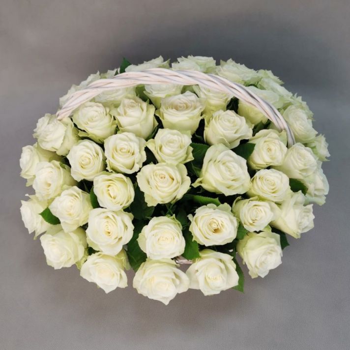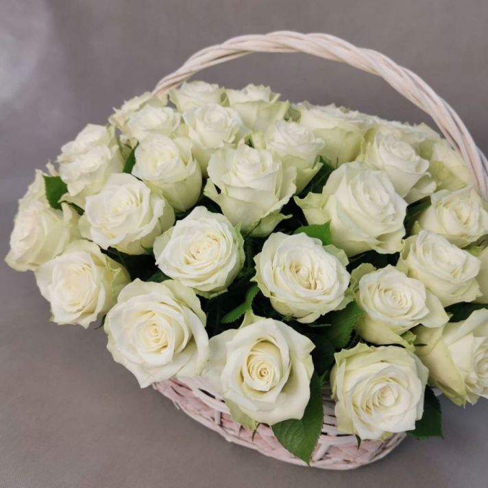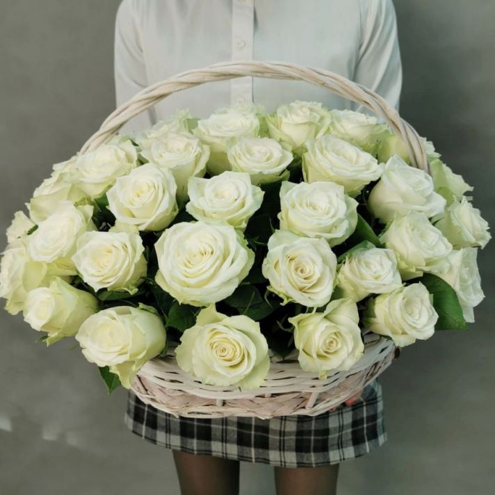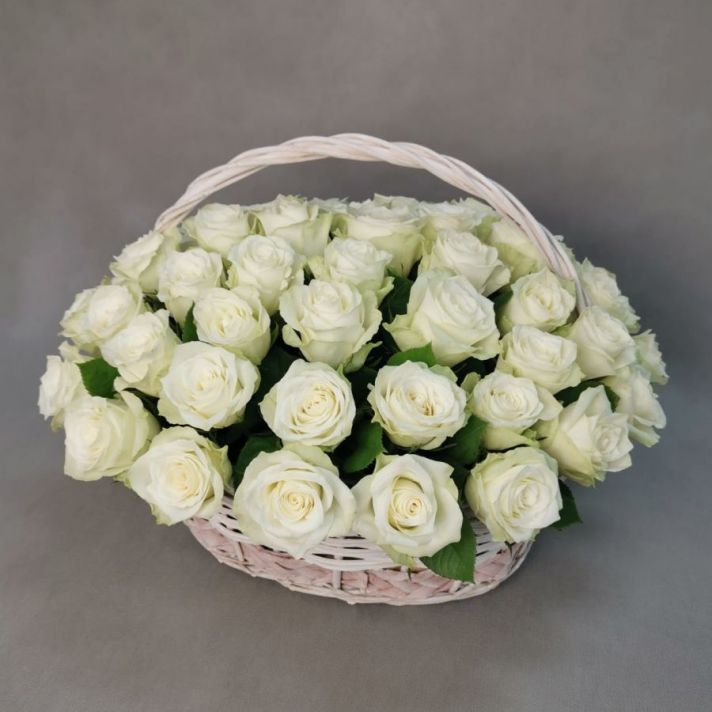 Роскошная корзина из 51 белой розы Кенийской "Белое волшебство" - лаконичный подарок на юбилей, день рождения, на свадьбу, на рождение.