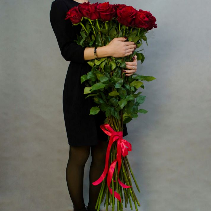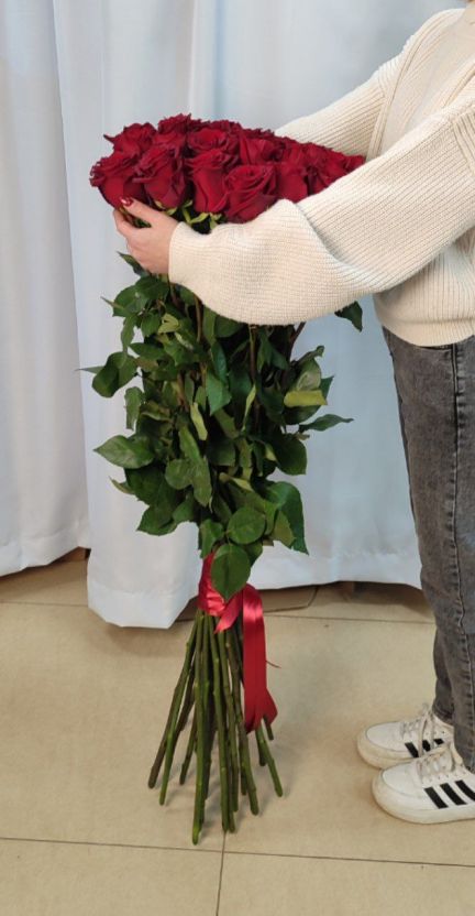 Букет из красных роз выше метра сорта Эксплорер, собранных под ленту. Количество роз можно выбирать.