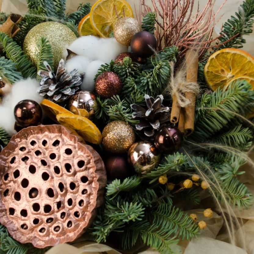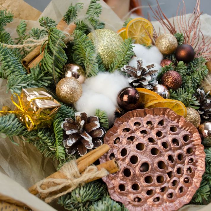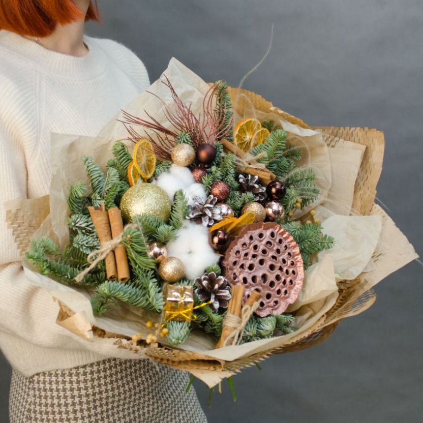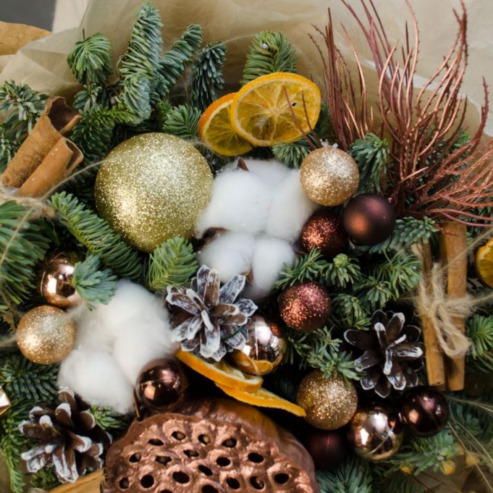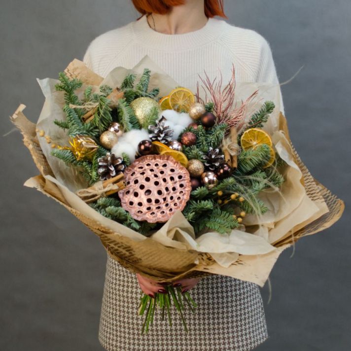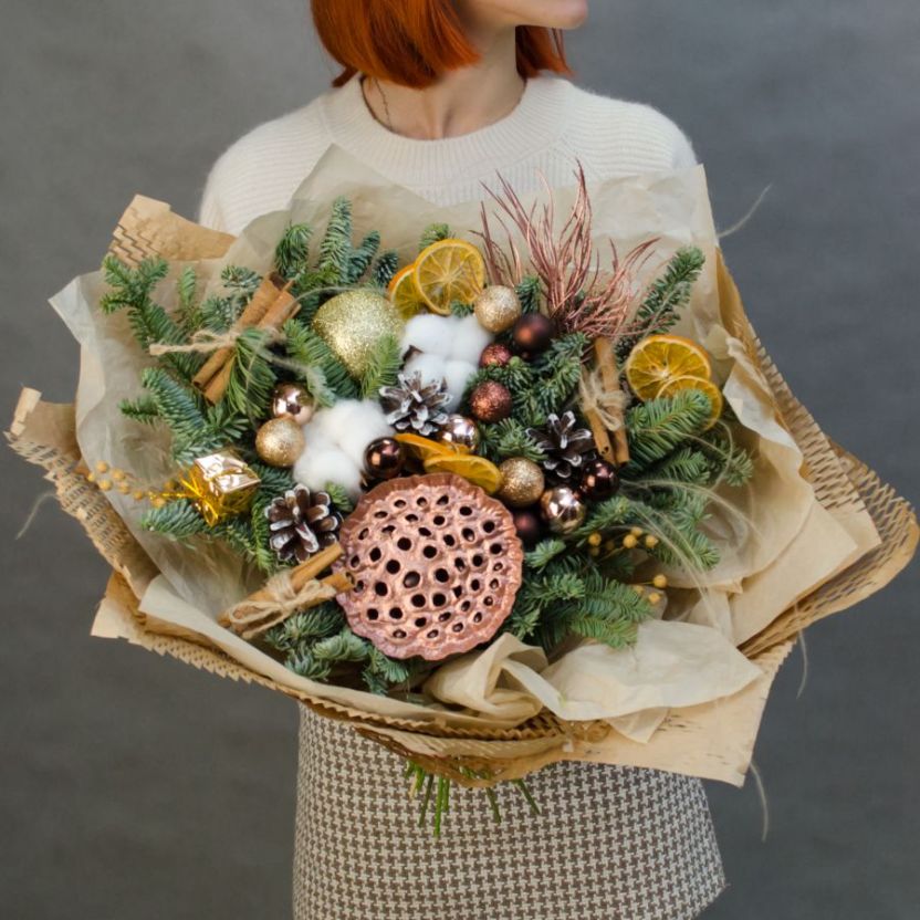 Состав: лотос 1, хлопок 2, ветки нобилиса (датская ель), шар новогодний 11, шишки, корица 6 шт, декор, упаковка крафт бумага, атласная лента.